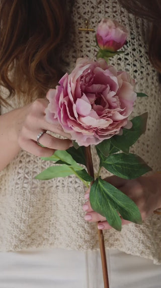 This faux blush Peony stem has a beautiful. authentic appearance, featuring an abundance of blush petals and a fully open bloom, along with a budded side shoot and luxurious green foliage. This versatile stem can be arranged en masse for a striking presentation, or paired with our blush Magnolia and blush Eucalyptus for a cohesive look.