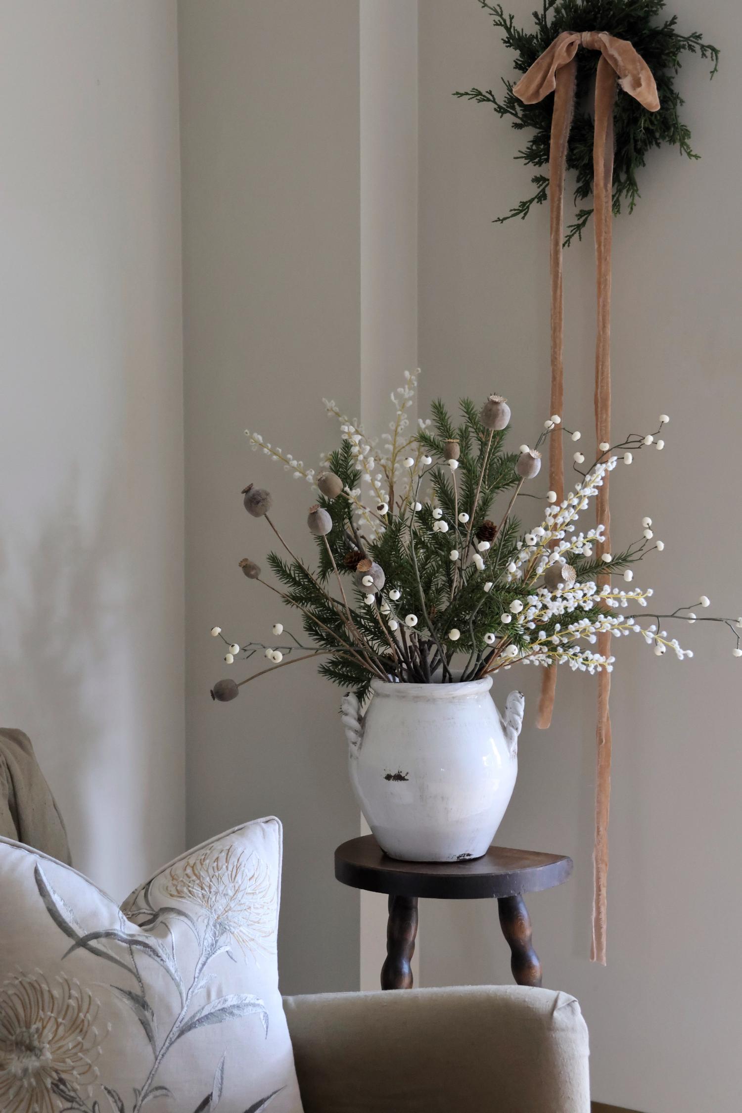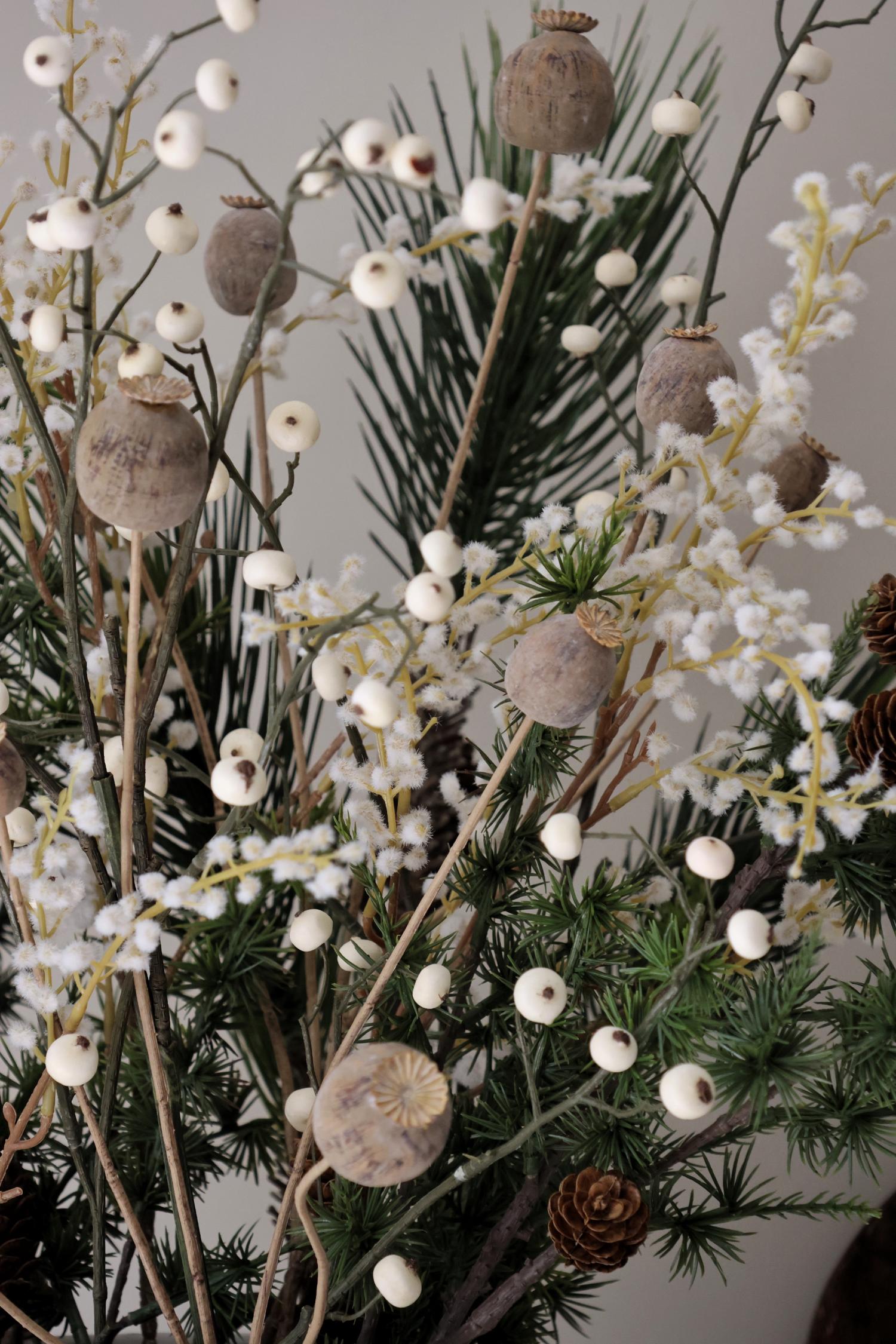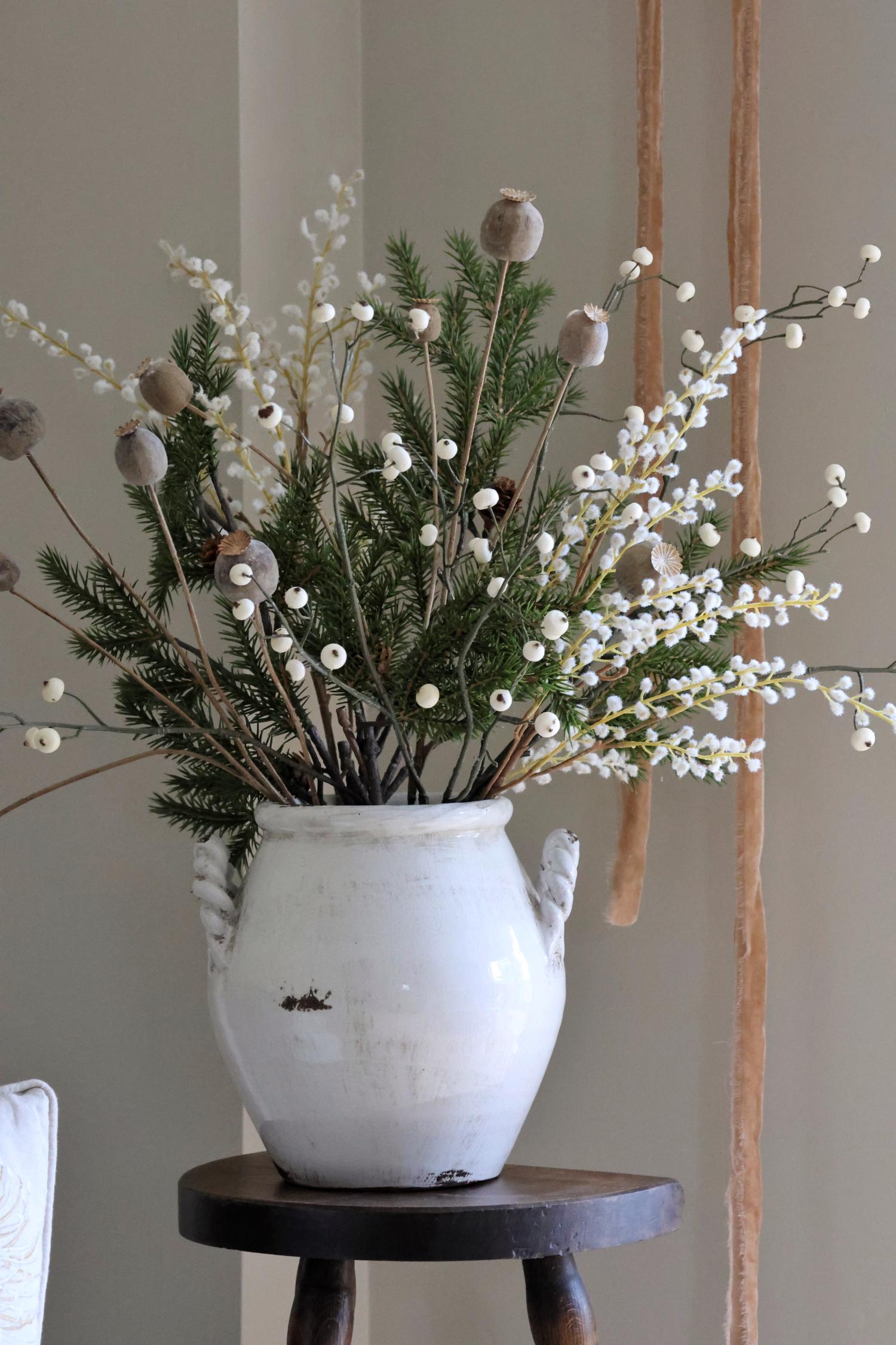 A timeless arrangement you can enjoy year after year featuring textural white berries, delicate white willow, poppy head and lush green foliage.