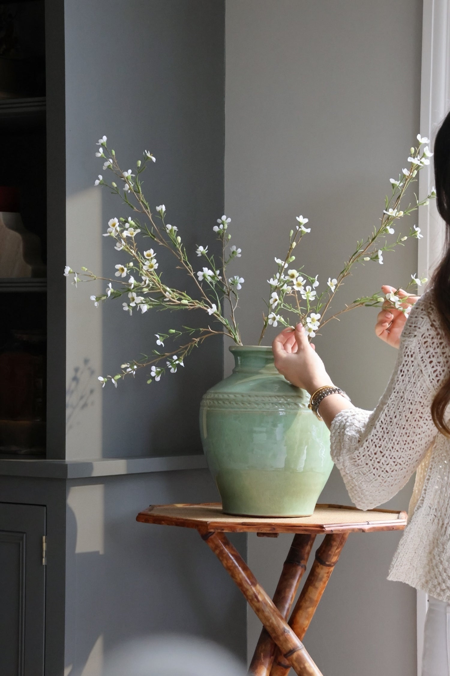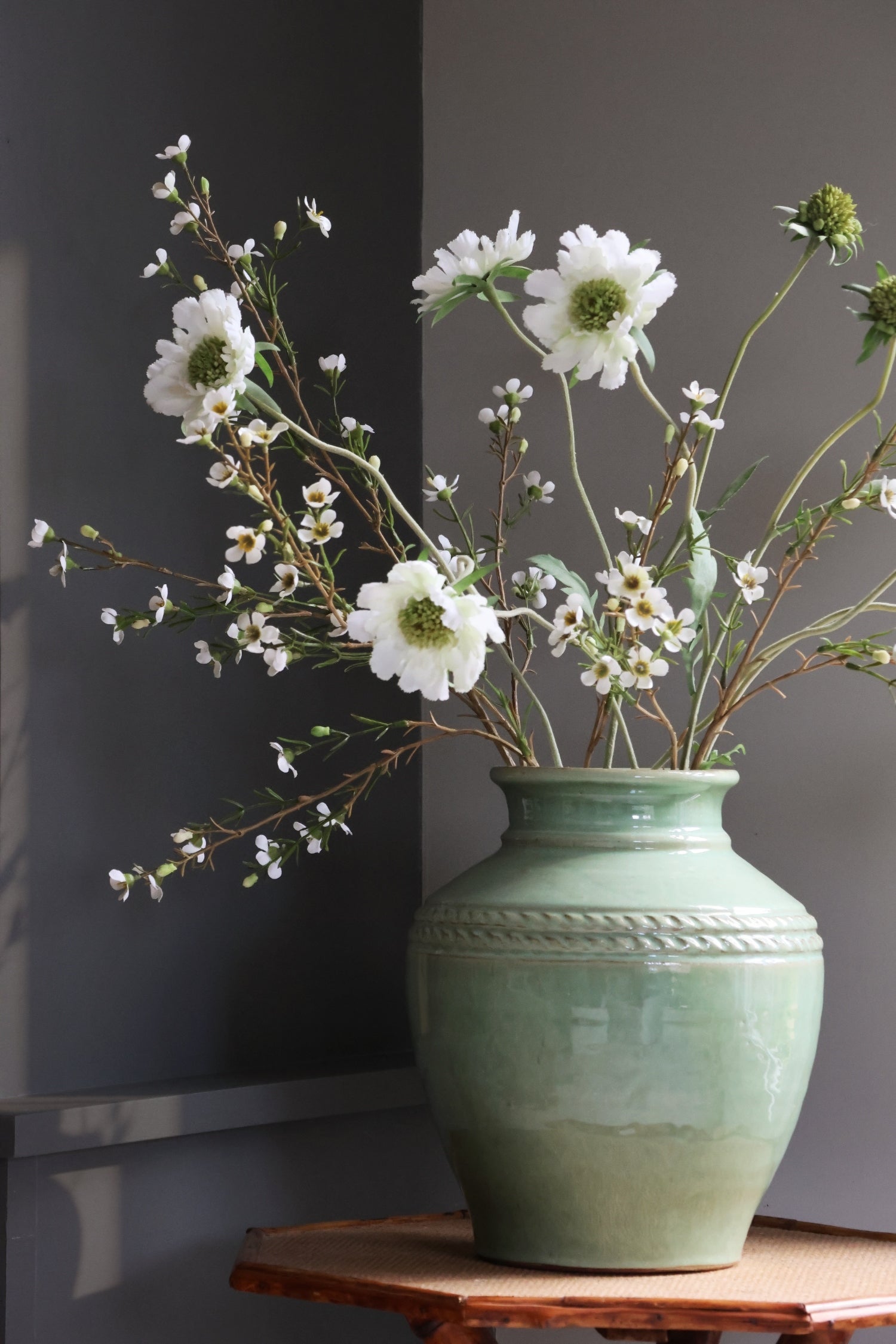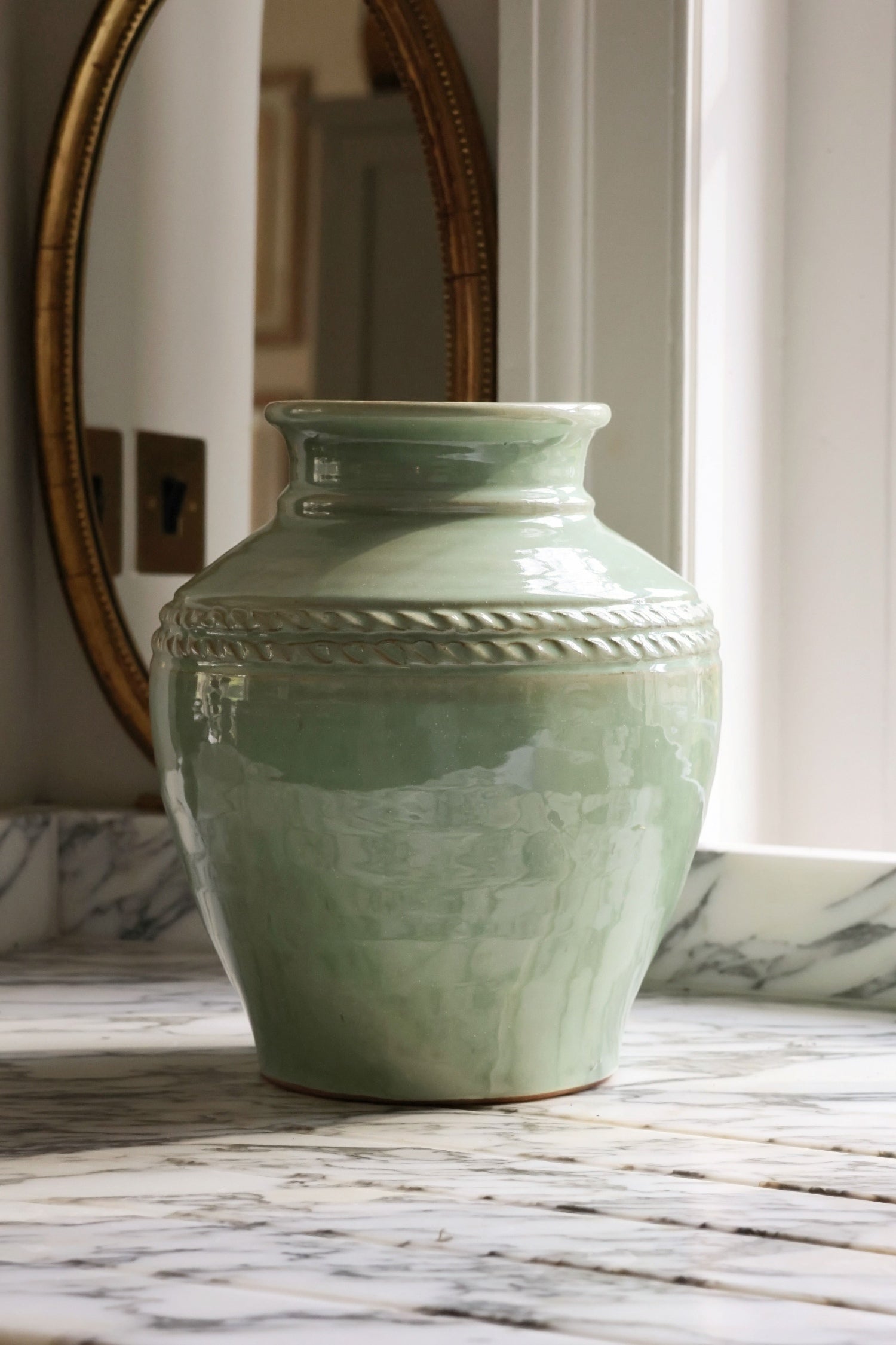 Our Gipping vase is a timeless ceramic piece designed to bring elegance to your home. Finished in a beautiful soft sage green glaze, this vase features gently rounded proportions and a delicate rope detail around the tapered neck, adding subtle character. The artisanal glaze creates natural variations in tone, giving each piece a softly aged, heritage feel.