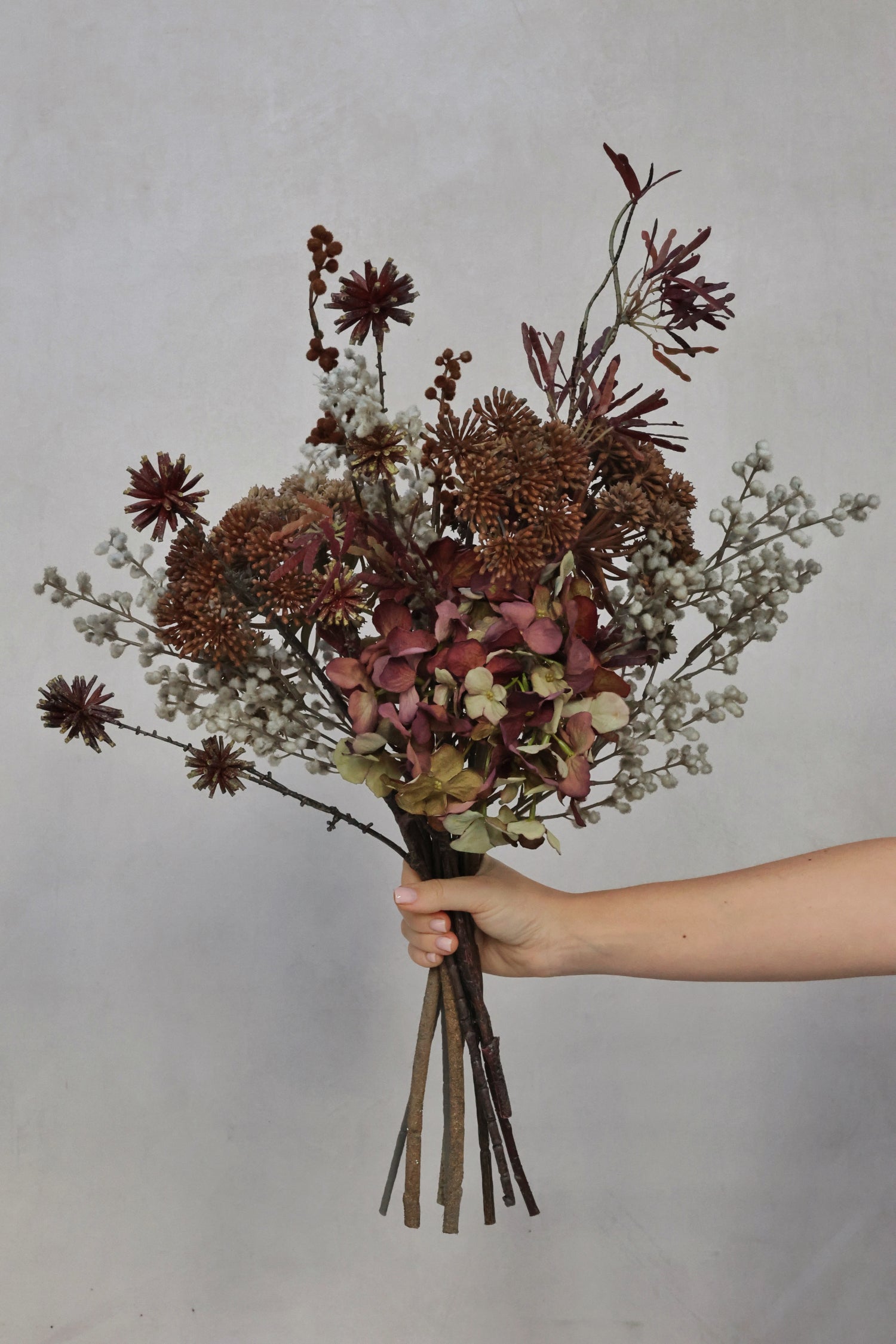 A beautiful autumnal bouquet comprised of foliage, mulberry hydrangea, achillea and echinops for a textural, deep plum toned arrangement.