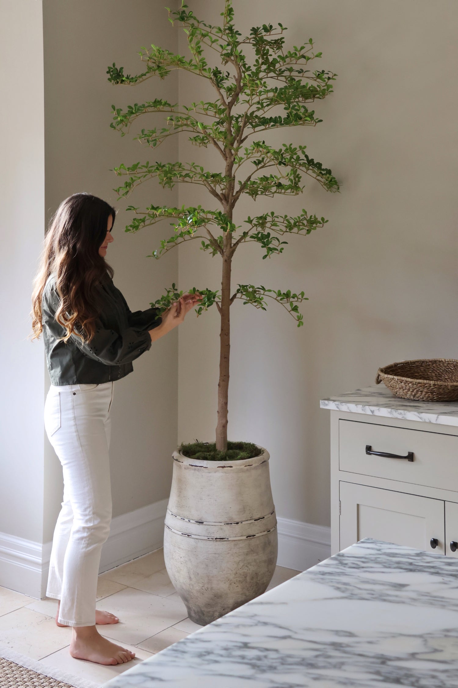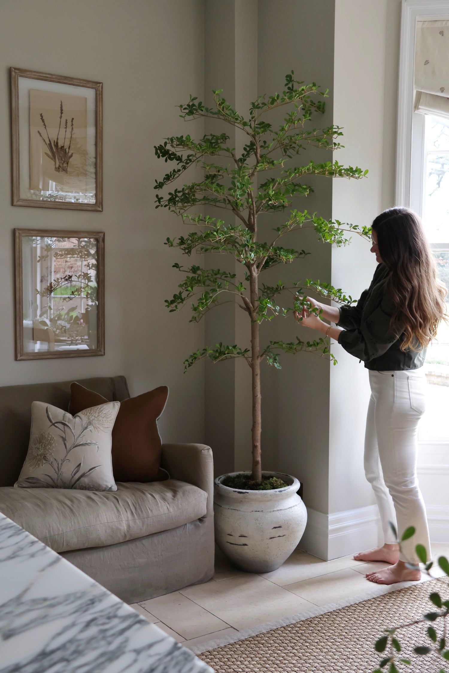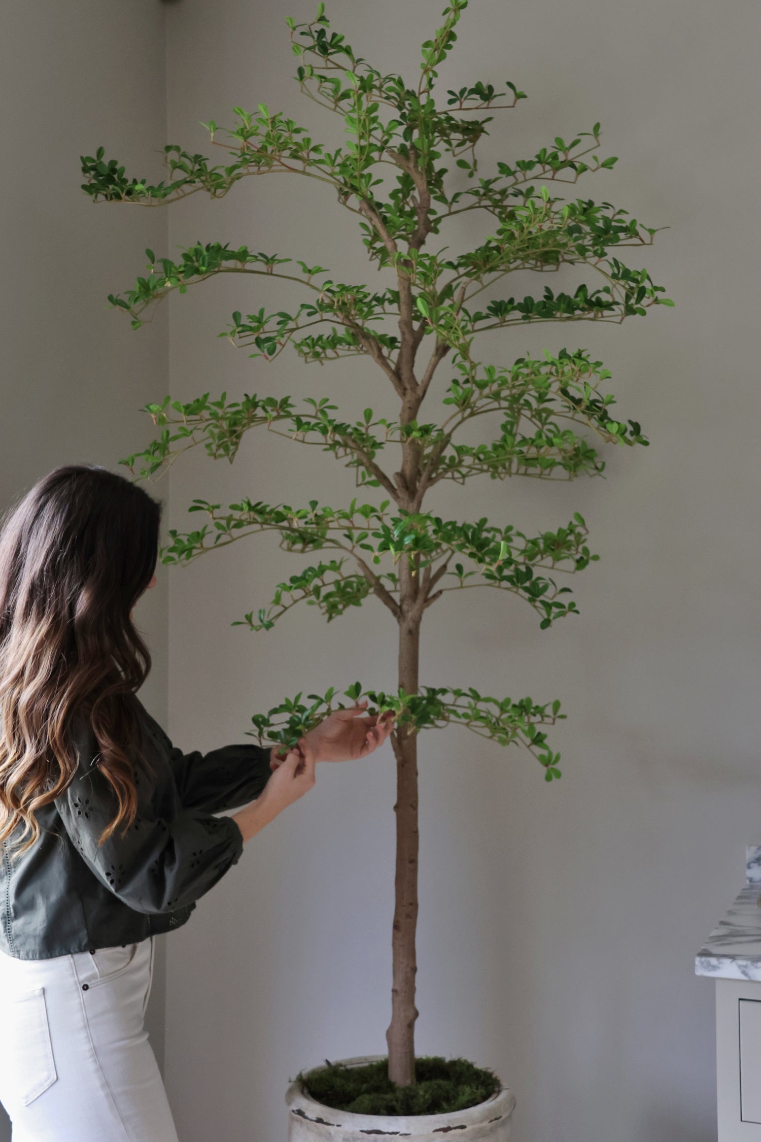 Our Faux Japanese Quince Tree is a beautifully sculptural statement designed to draw the eye upward and instantly add height to any space. Featuring highly realistic foliage and a true-to-nature branching structure, this elegant tree brings a fresh, organic feel without the need for watering.