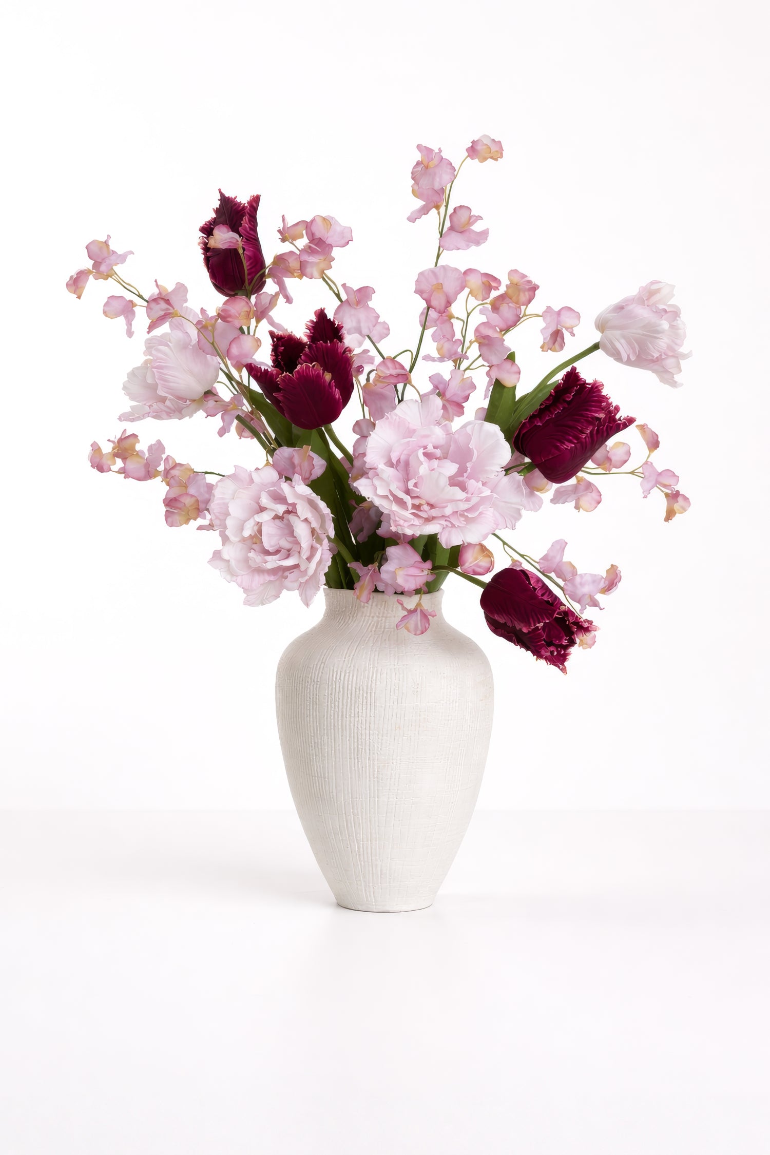 This elegant bundle pairs our textured Nayland vase with eight of our most-loved lilac and purple tulips and sweetpeas.