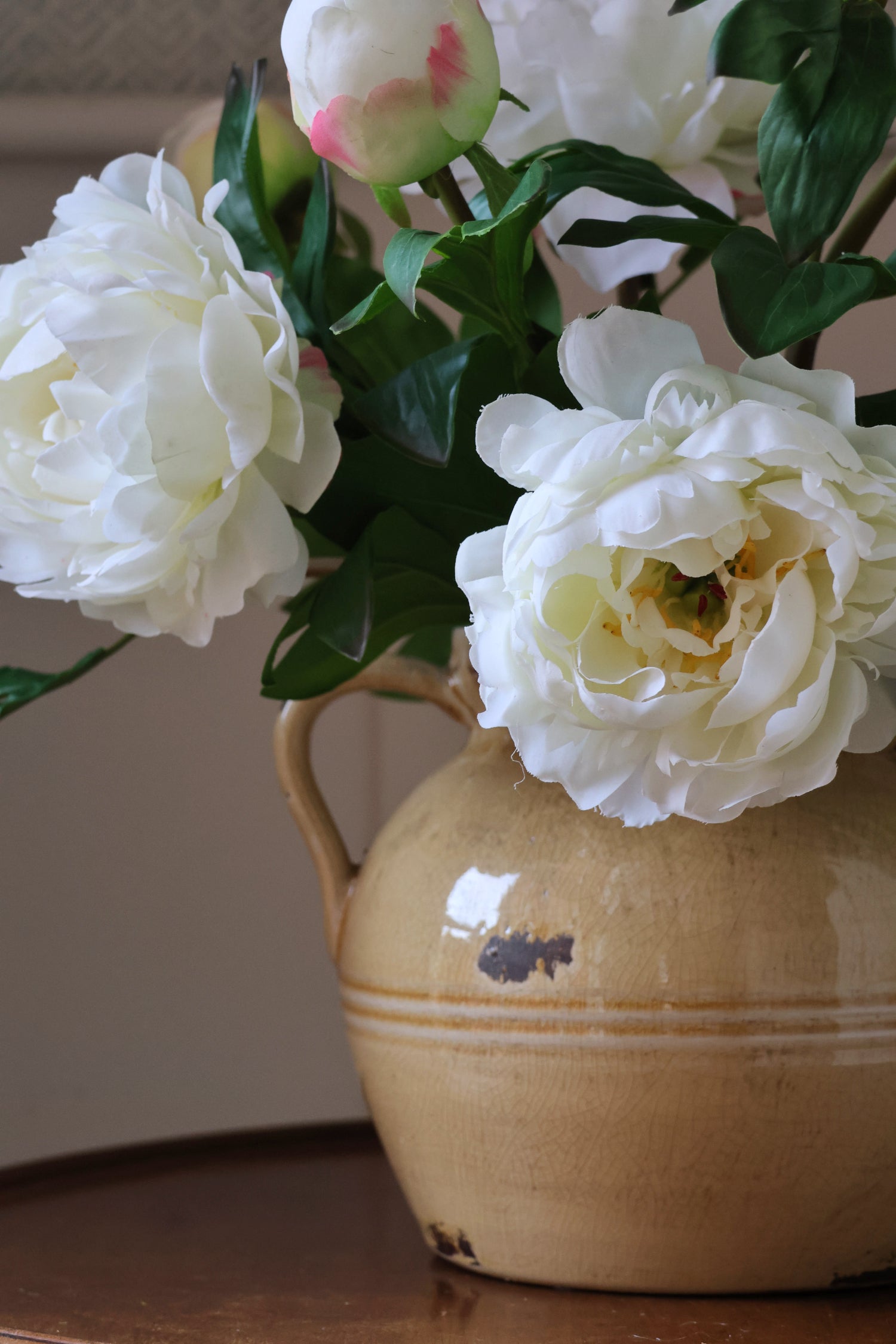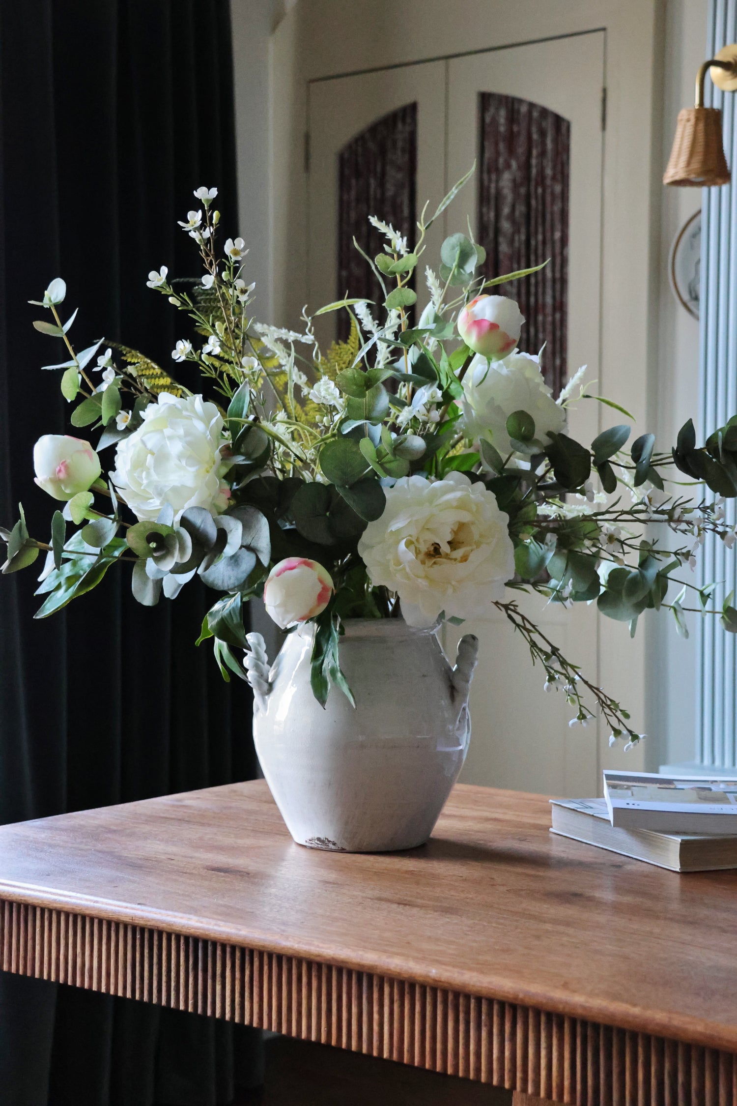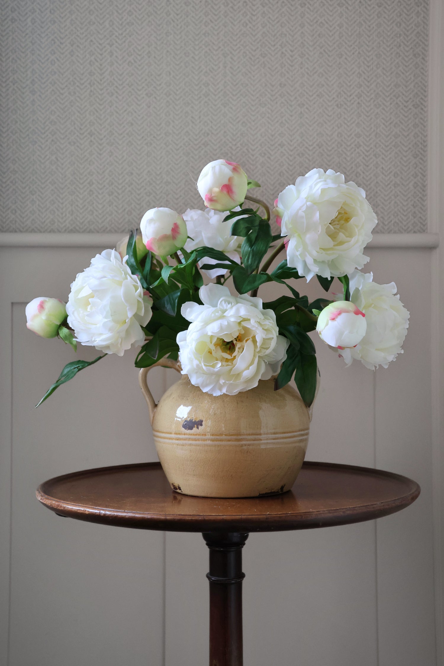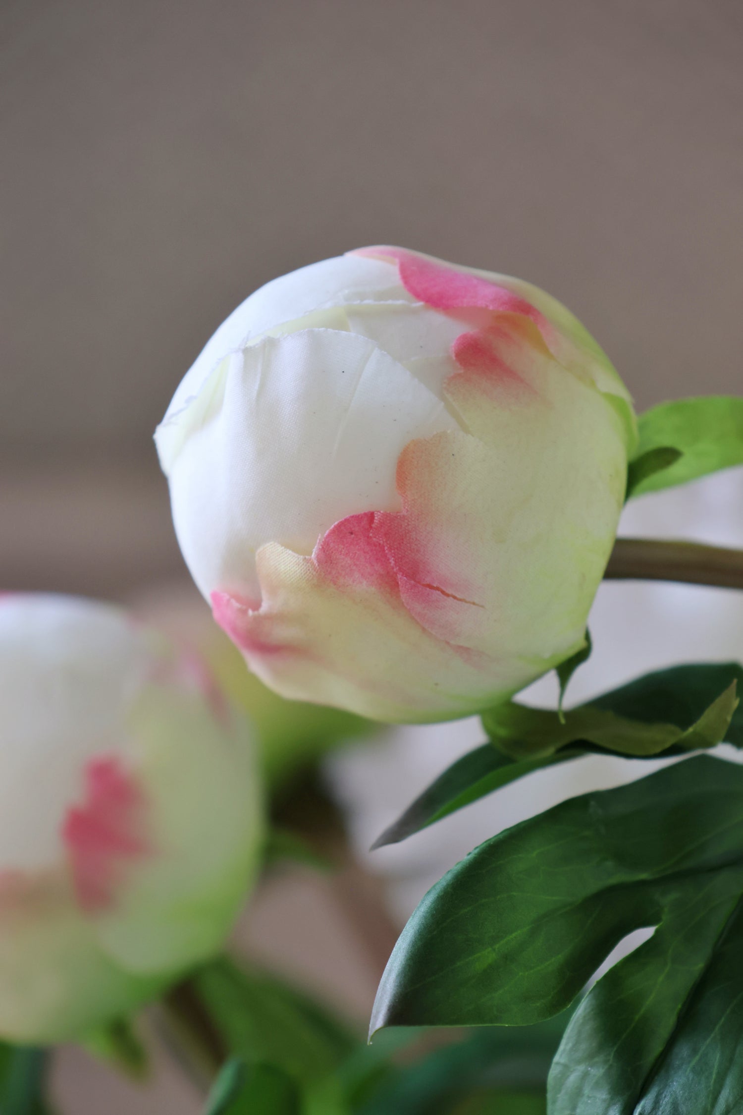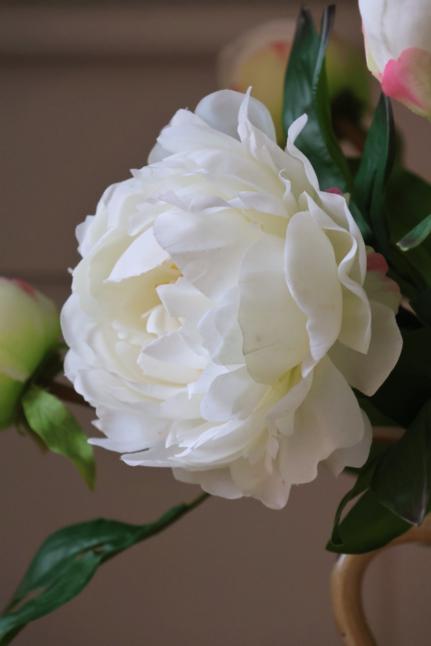 A beautifully realistic faux white peony stem with one fully open bloom, a delicately blushed bud, and lush green foliage. Perfect on its own in a vase or mixed with white florals and greenery for a soft, timeless arrangement. We love the ruffled petals and the natural-looking pink shading on the bud. Subtle, elegant and instantly fresh.