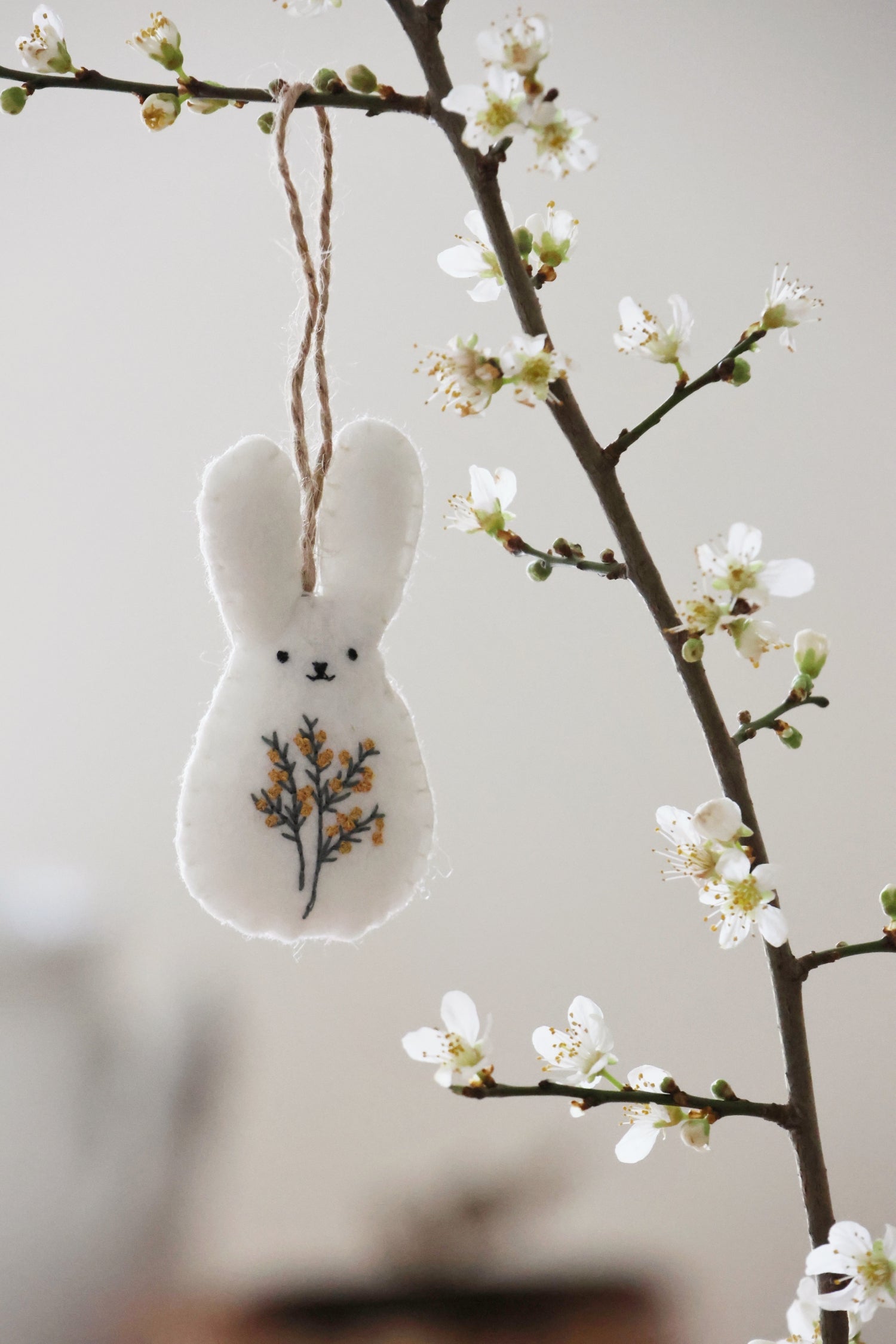 This sweet set of 2 felt Easter bunnies features intricate embroidery details. One adorned with a mustard stitched bow, the other with a floral motif. Softly padded for a beautiful shape and finished with a jute hanging loop, they're perfect for decorating branches, cakes, or tablescapes.