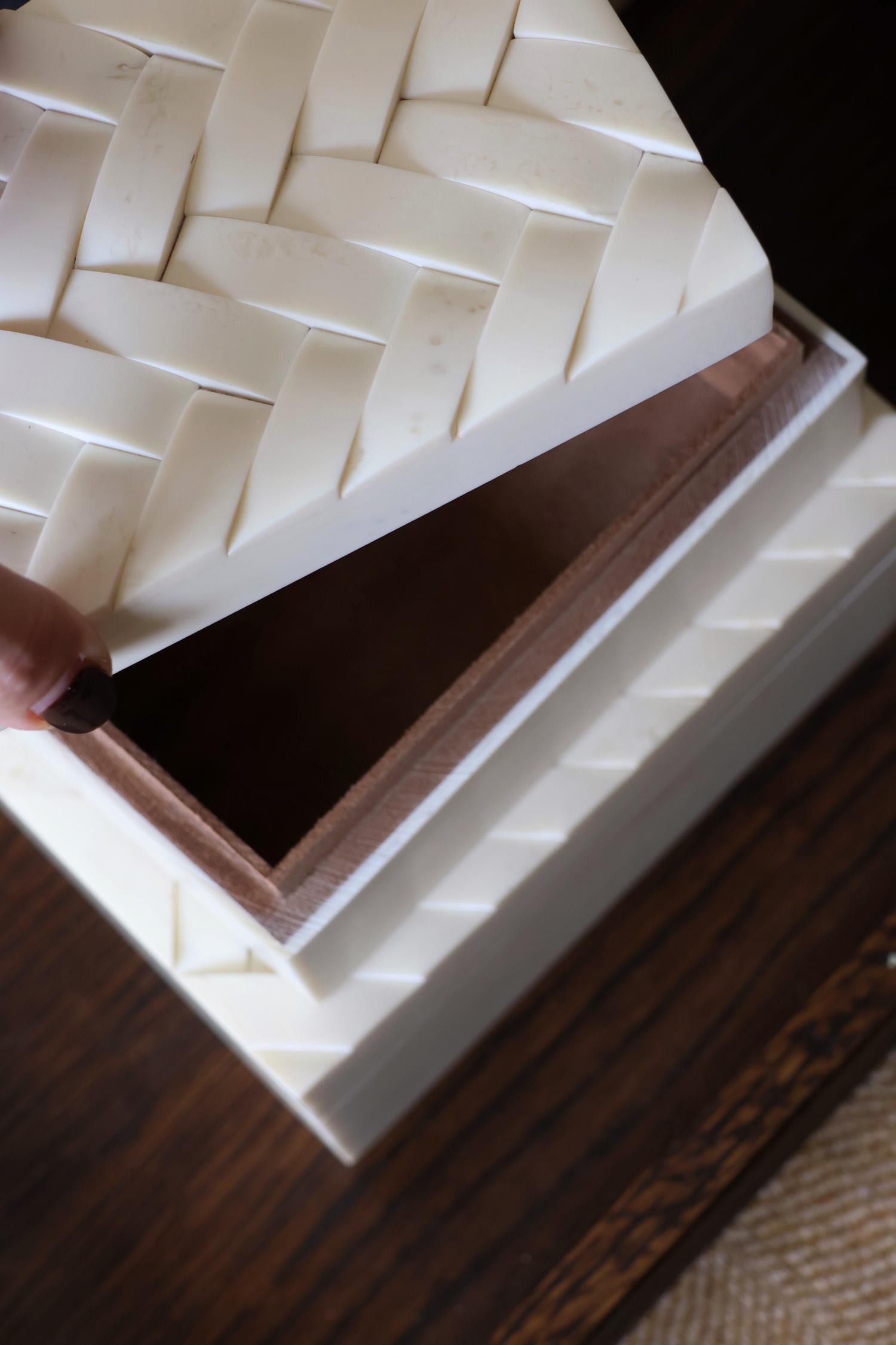 The Herringbone Resin Boxes feature a timeless raised herringbone braiding design in cream. Ideal for enhancing coffee tables or shelves, their refined craftsmanship brings a sophisticated accent to any room. The smaller box nests neatly within the larger one for versatile storage.