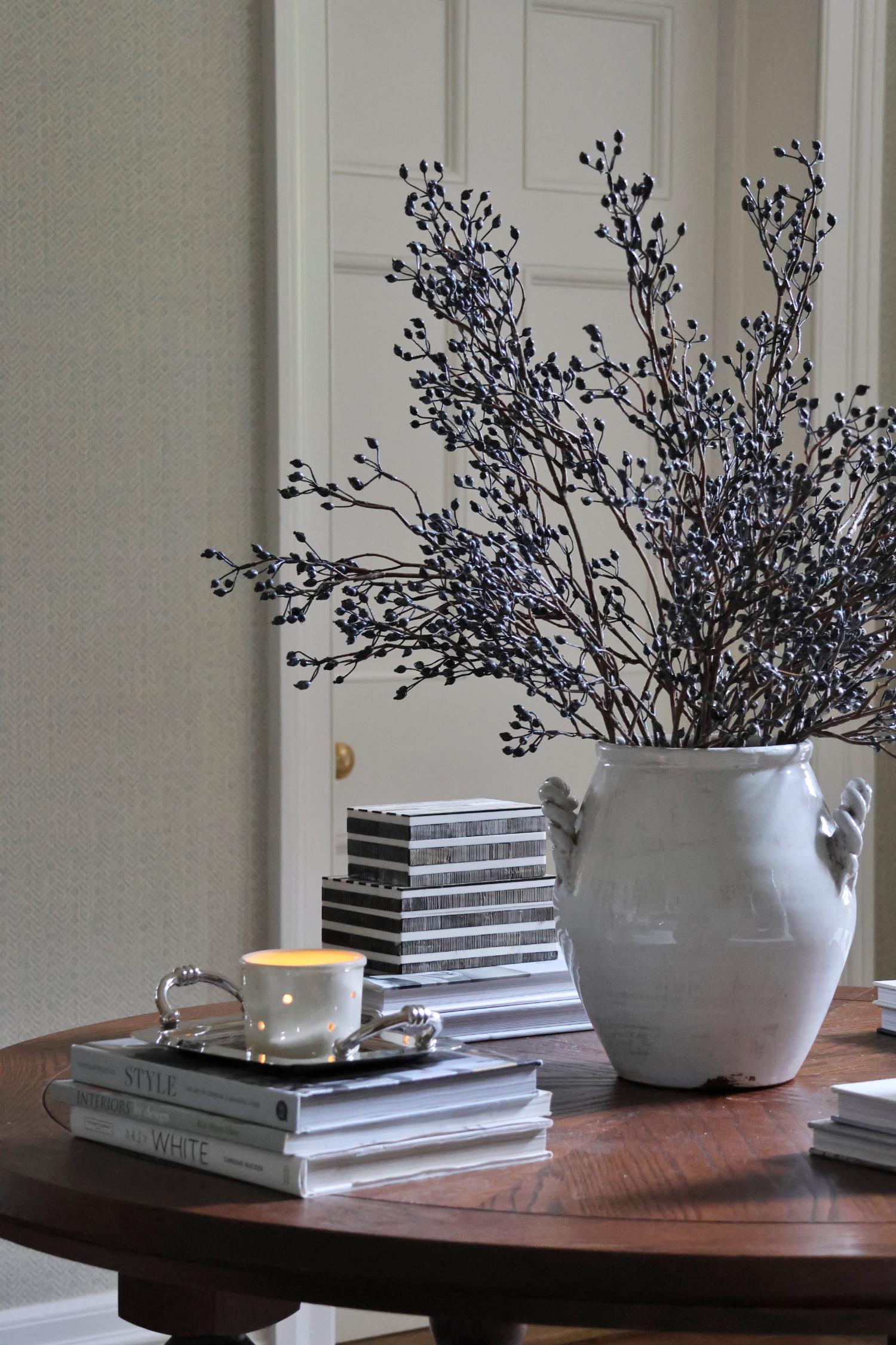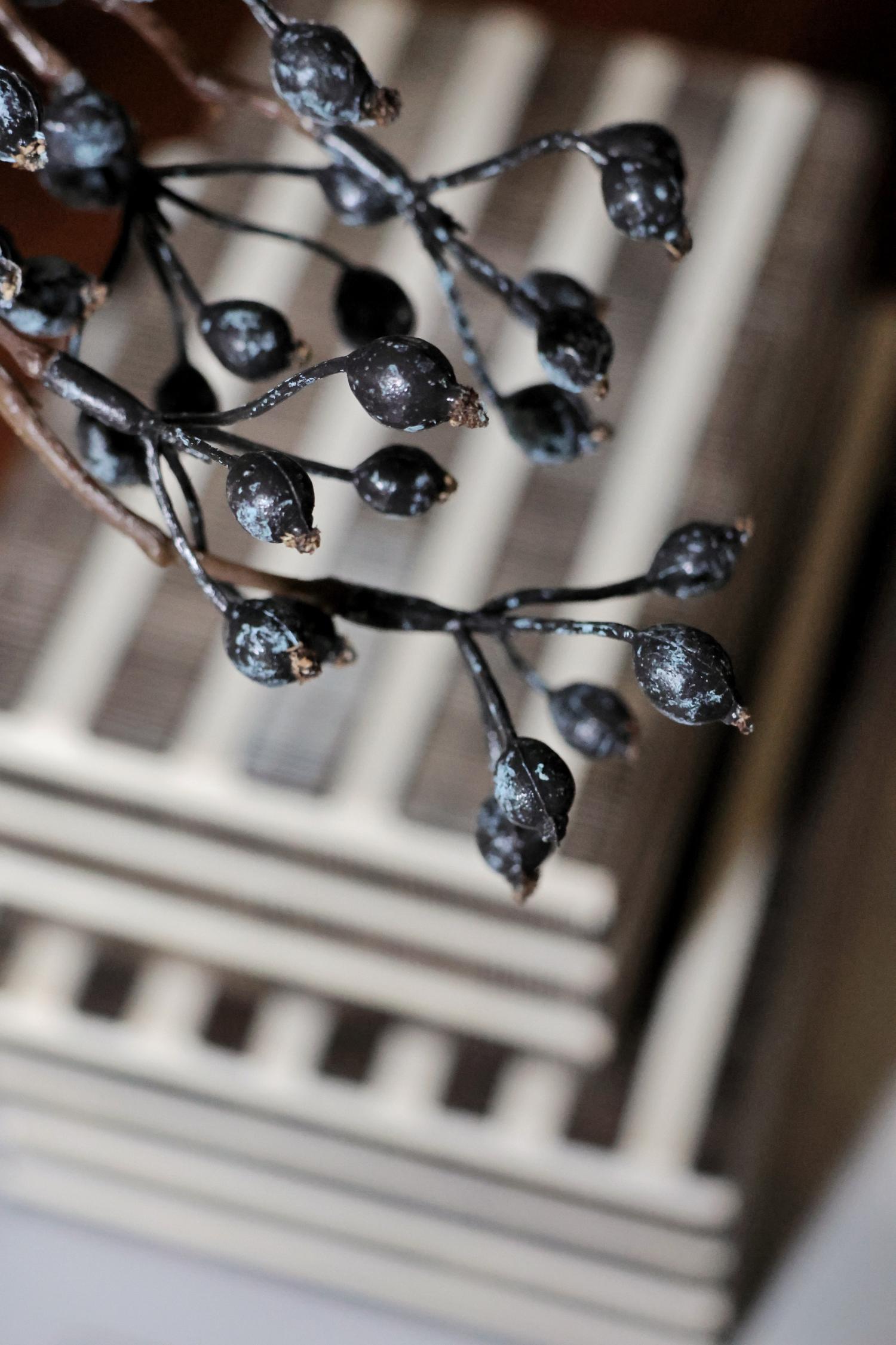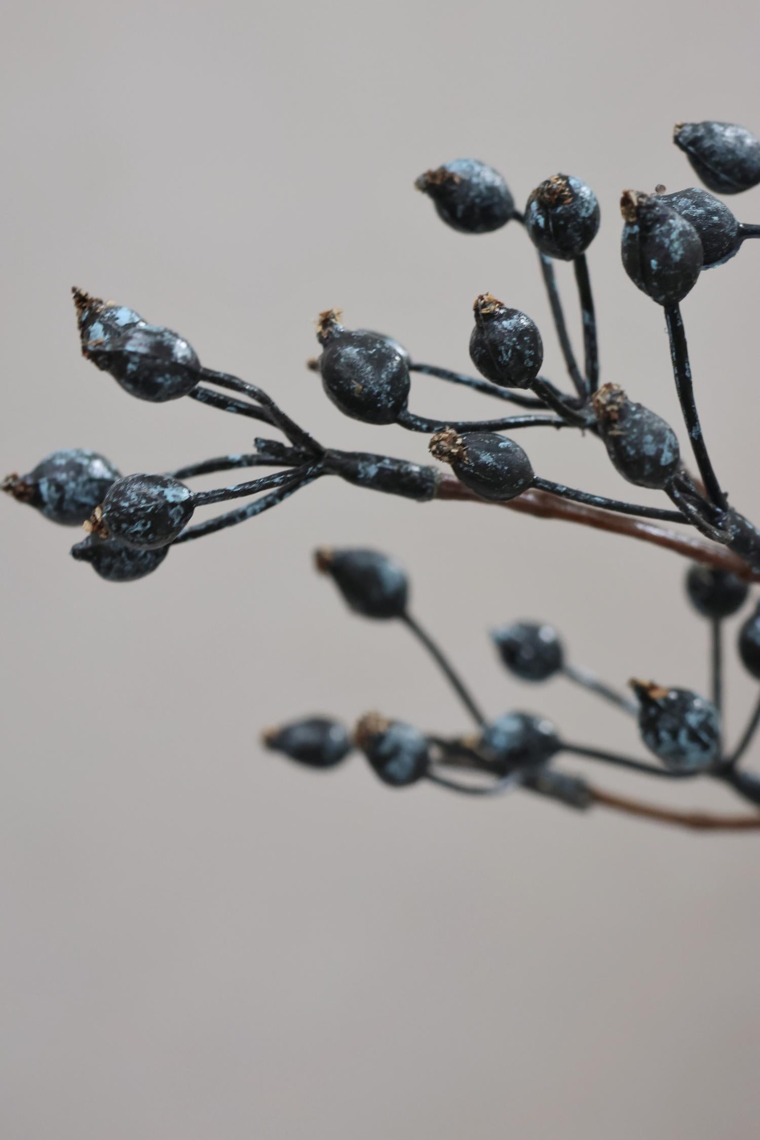 The Faux Blue Berry Branch is an beautiful complement to your winter greenery, enriching both texture and colour. Adorned with a generous scattering of small dark blue berries, it stands out equally well solo or combined with our faux Larix, Fir, Cone, and Poppy sprays, creating a striking winter display.