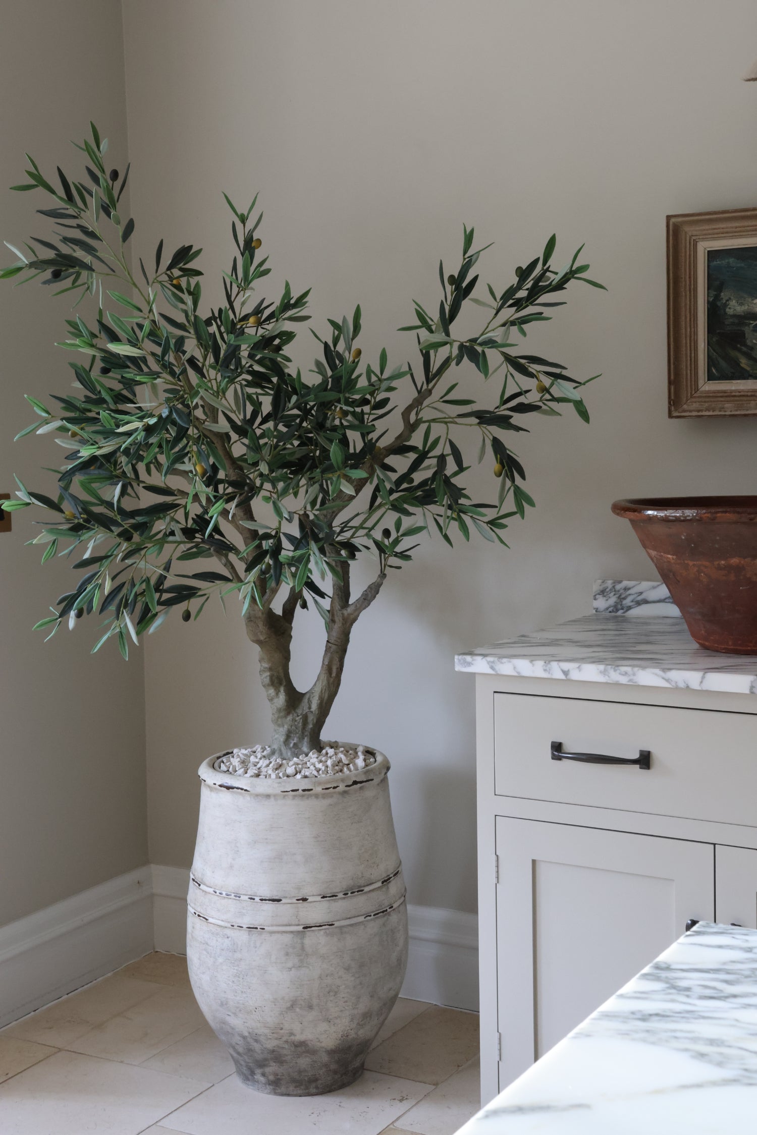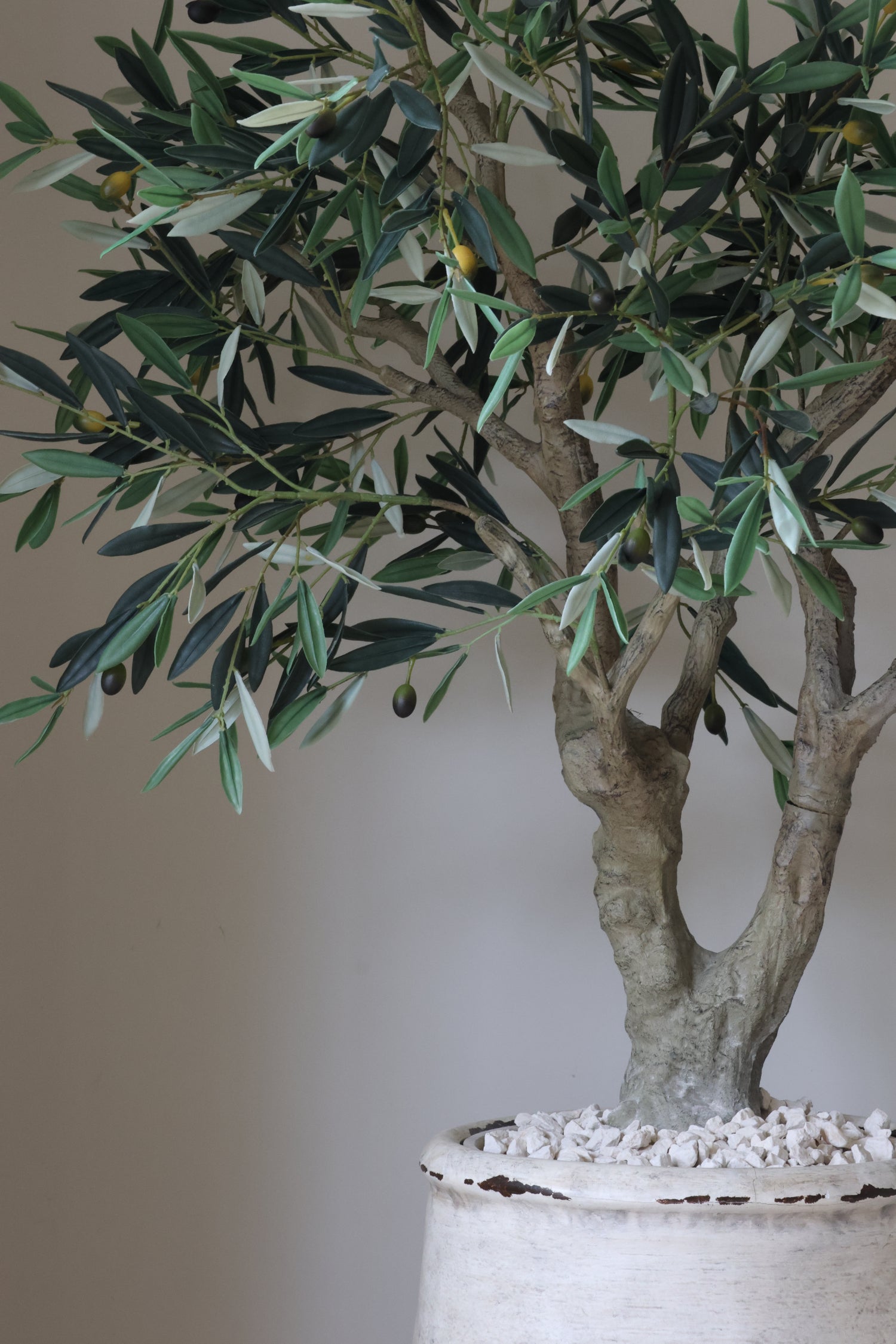 This faux Olive tree emulates the beauty of ancient Olive trees found in the Mediterranean, complete with gnarly trunks and lifelike leaves and olives. It has a realistic multi-stemmed trunk with an abundance of leaves and olives. This tree certainly brings the 'wow' factor to any space.