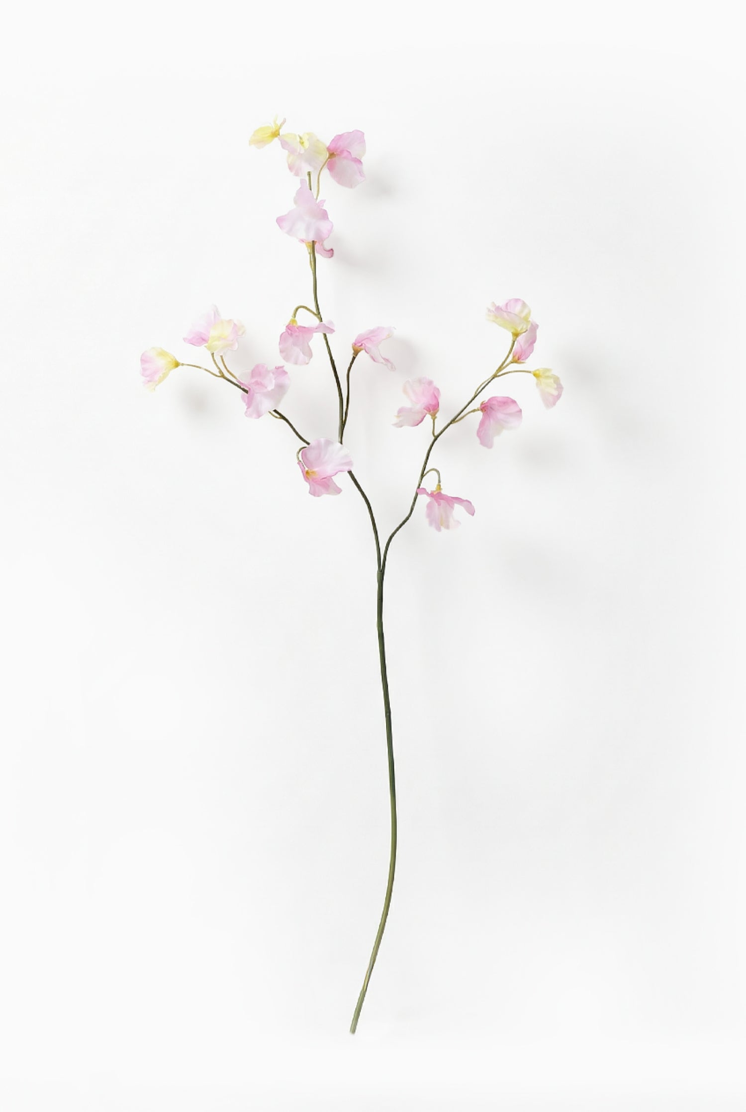 This Faux Pink Sweet Pea stem features beautiful details, with dainty, curved petals that effortlessly add movement, elegance and delicacy to any arrangement. This stunning bloom is perfect for creating a breathtaking arrangement, particularly when used en masse. Or style is with complimenting stems such as our faux pink double tulip and pink fringed tulip.