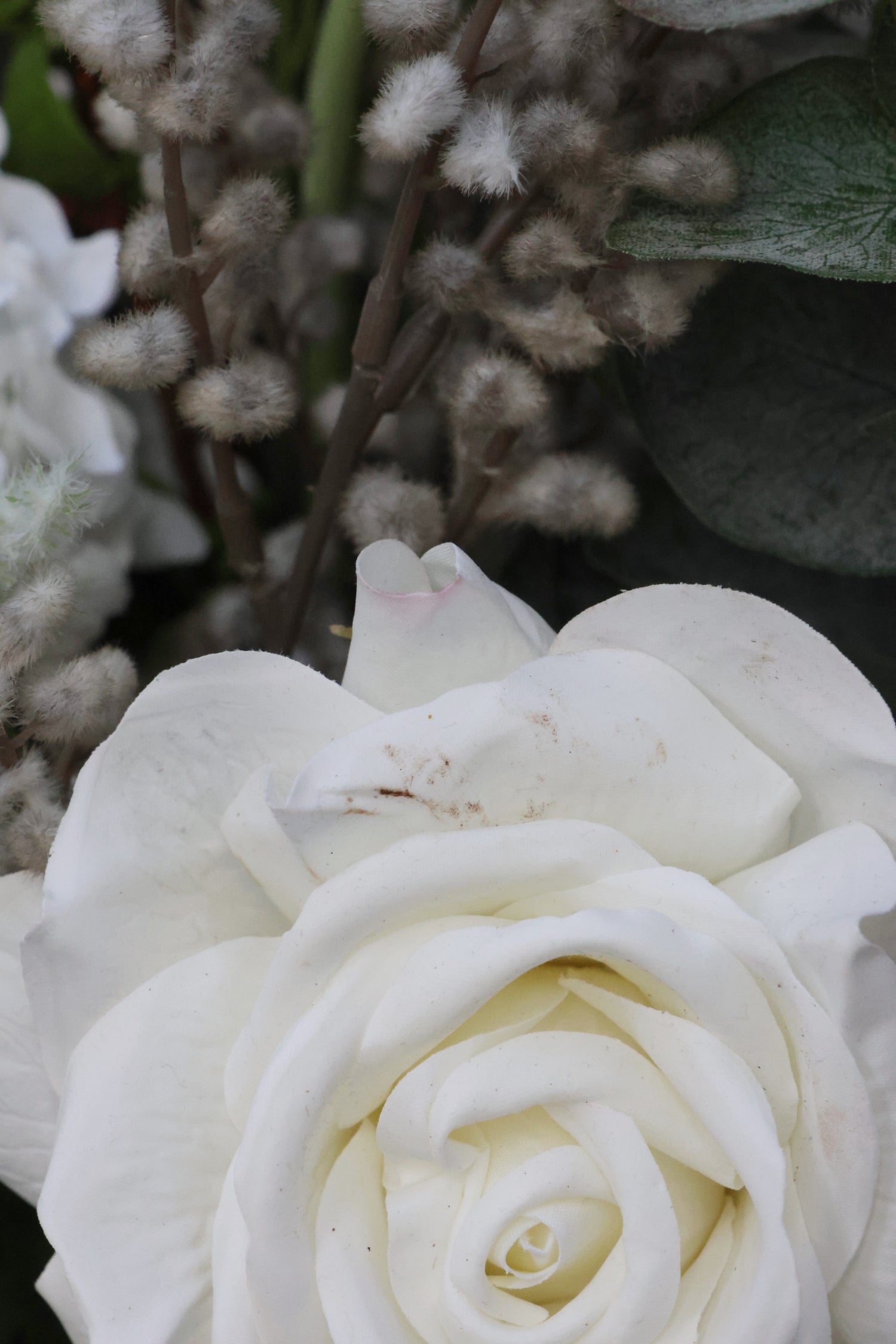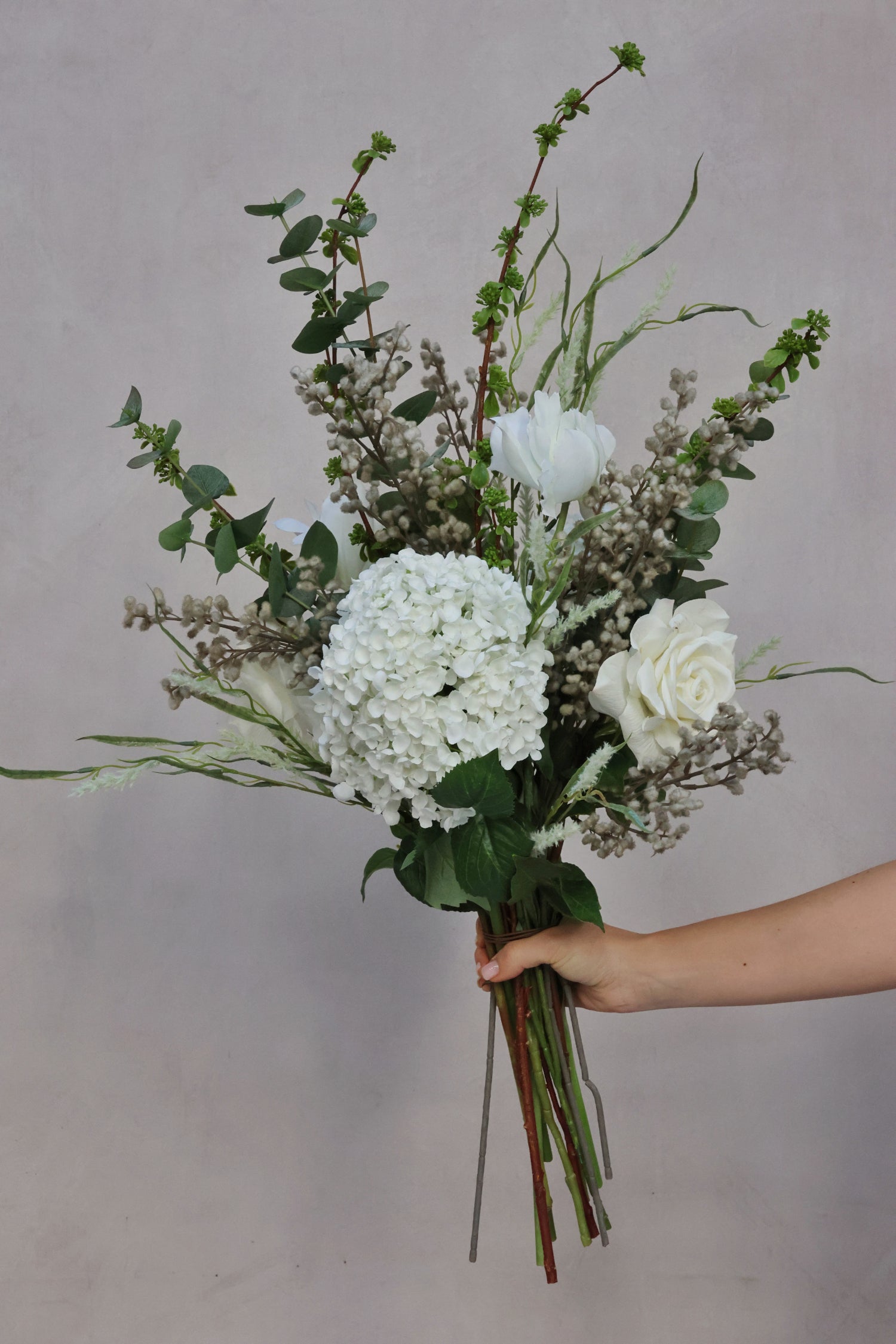 A classic combination of white hydrangea, roses and tulips amoungst eucalyptus, wild grass and green berries.