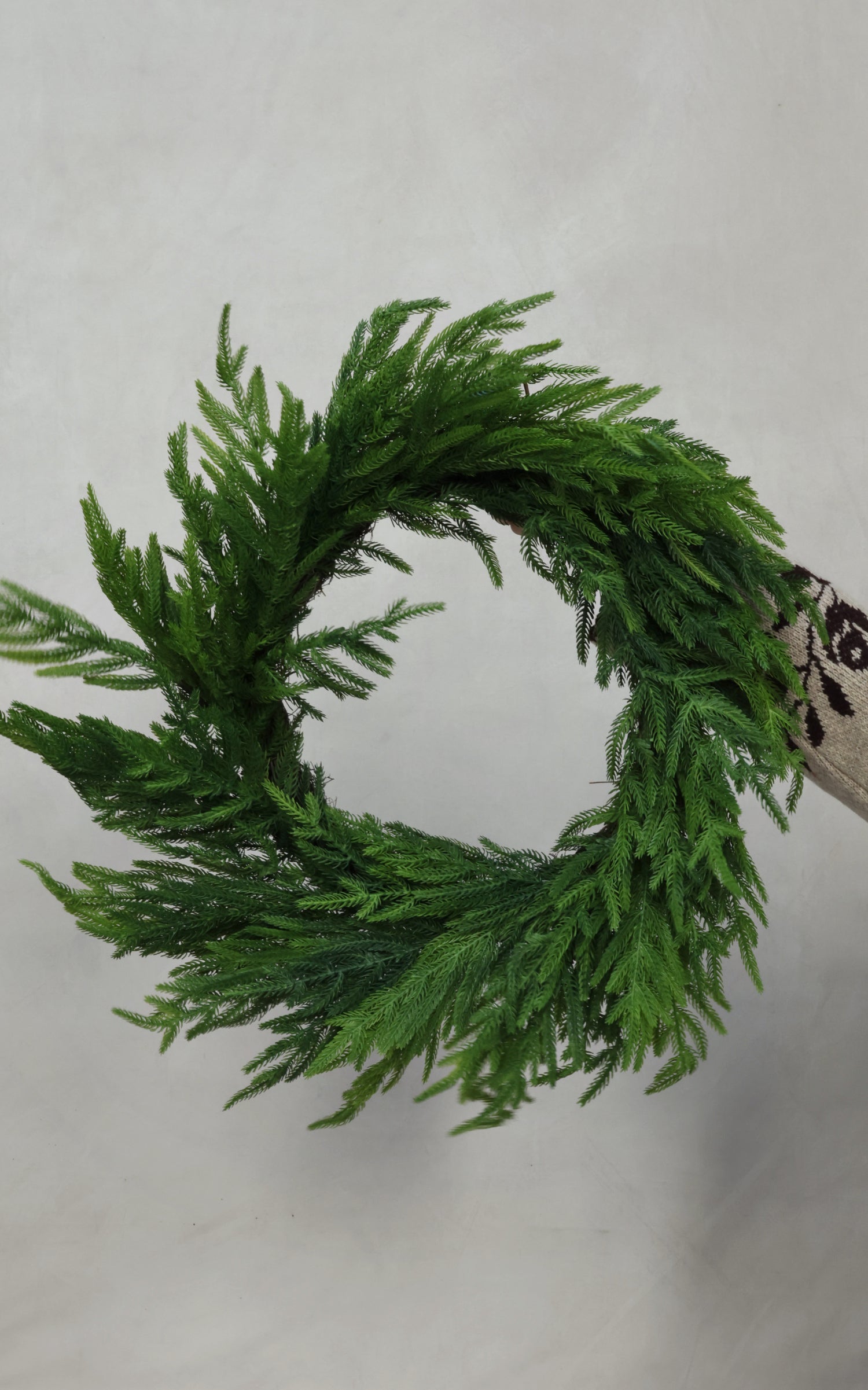Discover the realism of our faux Norfolk Pine wreath, crafted on a sturdy grapevine base with a convenient hanging hook. With an abundance of verdant foliage, our winter wreath brings the beauty of nature inside and offers long-lasting holiday greenery. The Norfolk Pine Wreath is the perfect decoration for a festive home this season.
