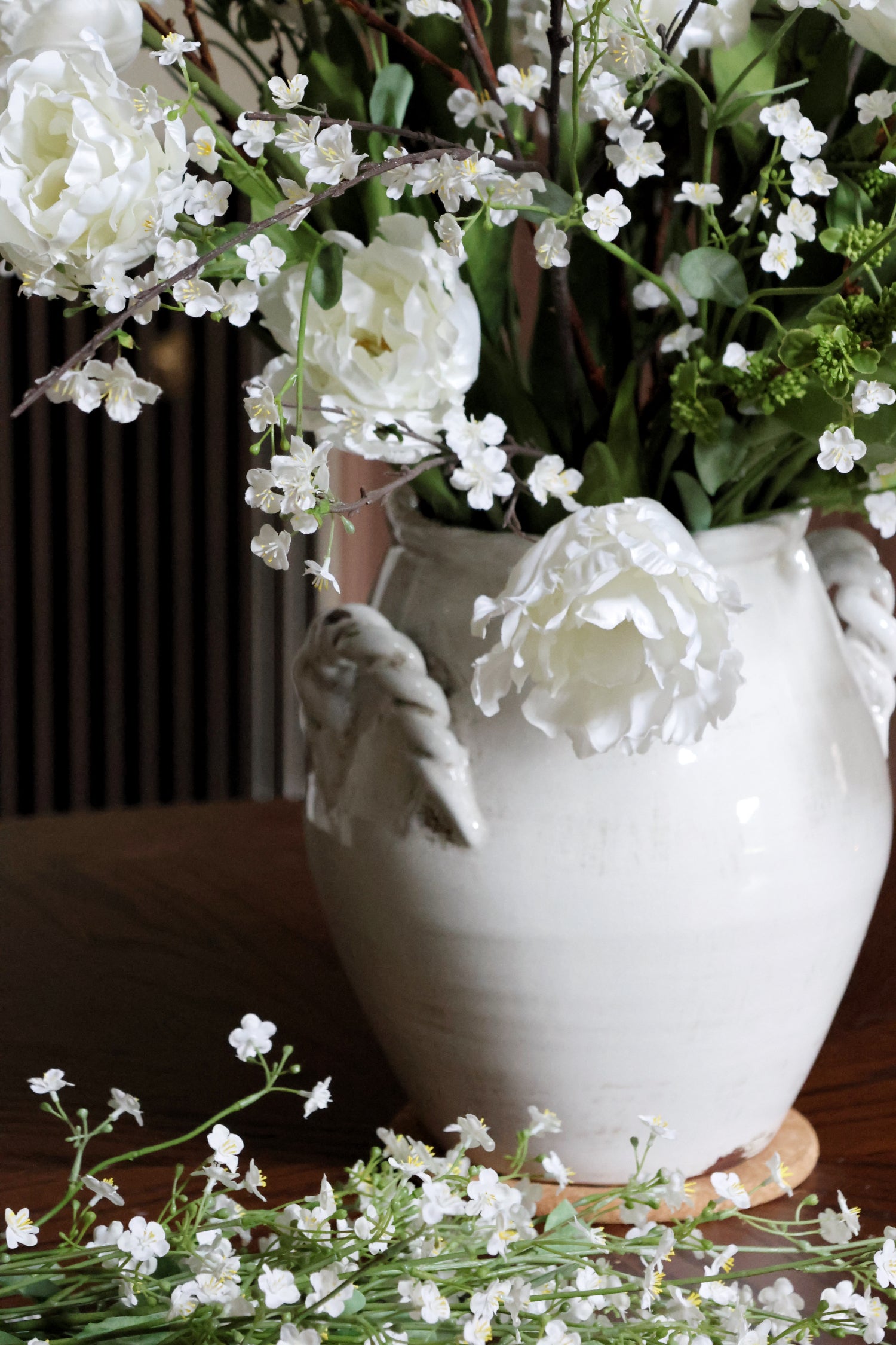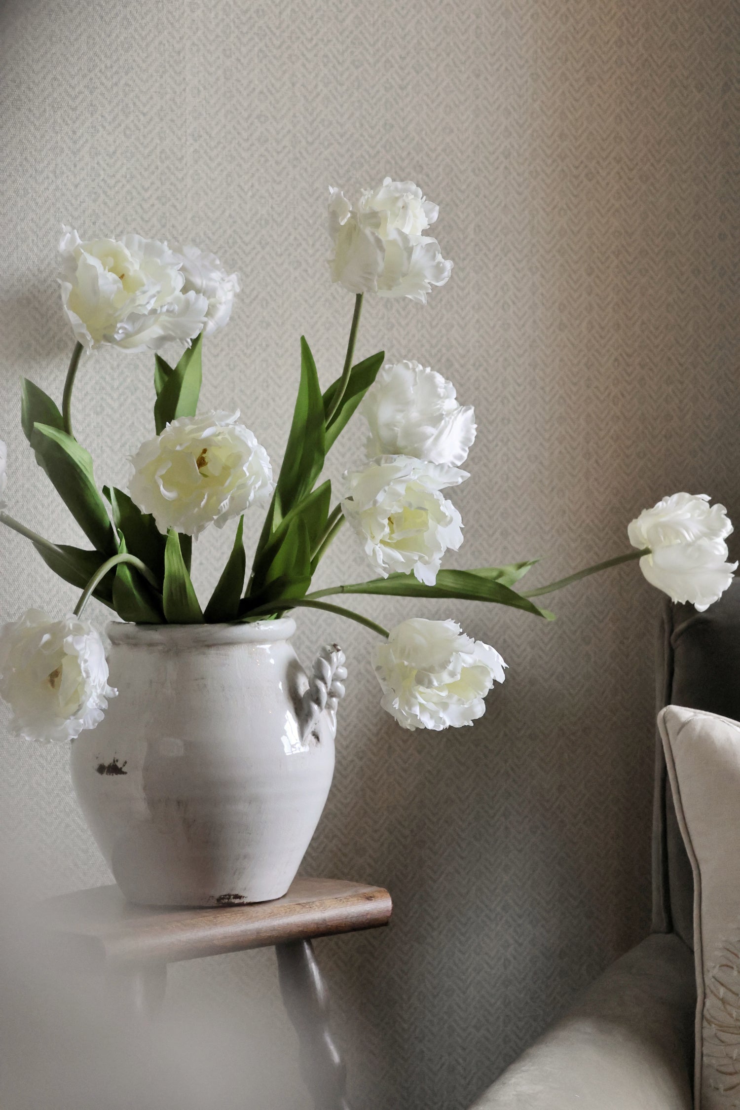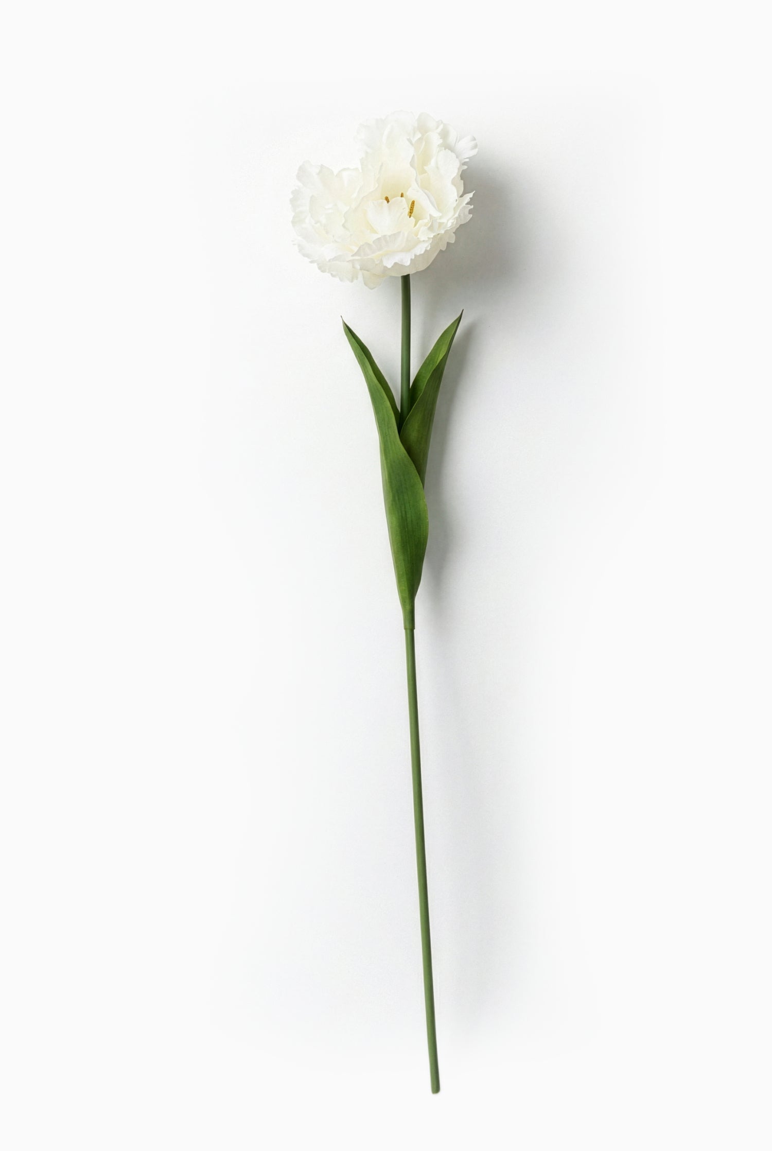 These faux tulips have large flower heads with multiple layers of blousy petals with ruffled edges in a timeless white colour. Pairs well with complementary stems including our faux forget-me-not, white parrot tulip, ranunculus and scabious.