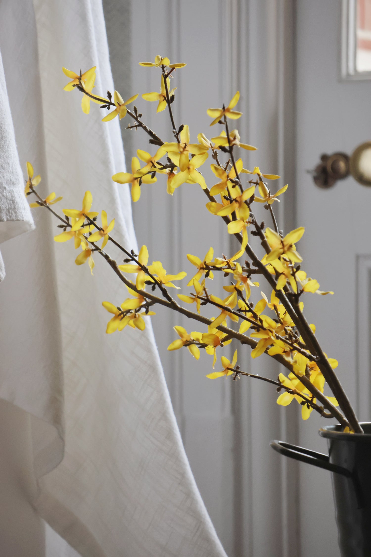 Our faux Forsythia branch brings instant light and vitality to a space. With its delicate buds and natural movement, it pairs beautifully with our faux cosmos or plum blossom stems, or creates a striking statement when styled en masse. We especially love this stem showcases in our Helmingham vase for an effortless, season-led arrangement.