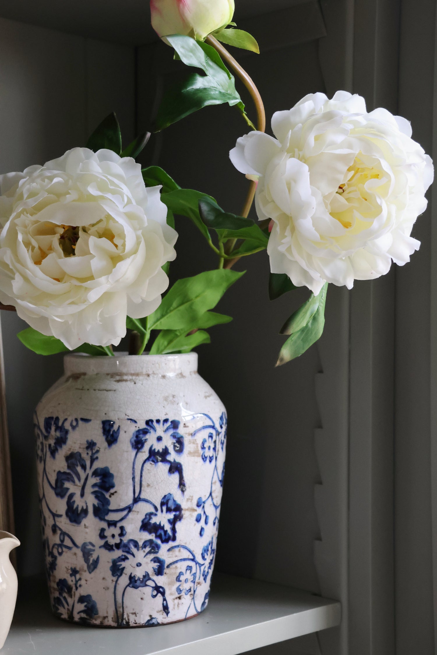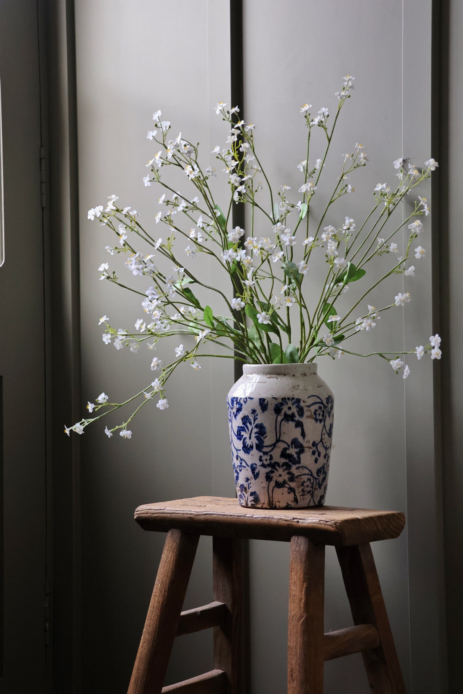 The Aspall Vase showcases a delicate dark blue floral pattern with a handcrafted, gently distressed finish and a softly tapered neck, creating an elegant and characterful piece. Perfect for styling on shelves, windowsills, or bedside tables, it adds a refined yet subtle pop of colour to any space.