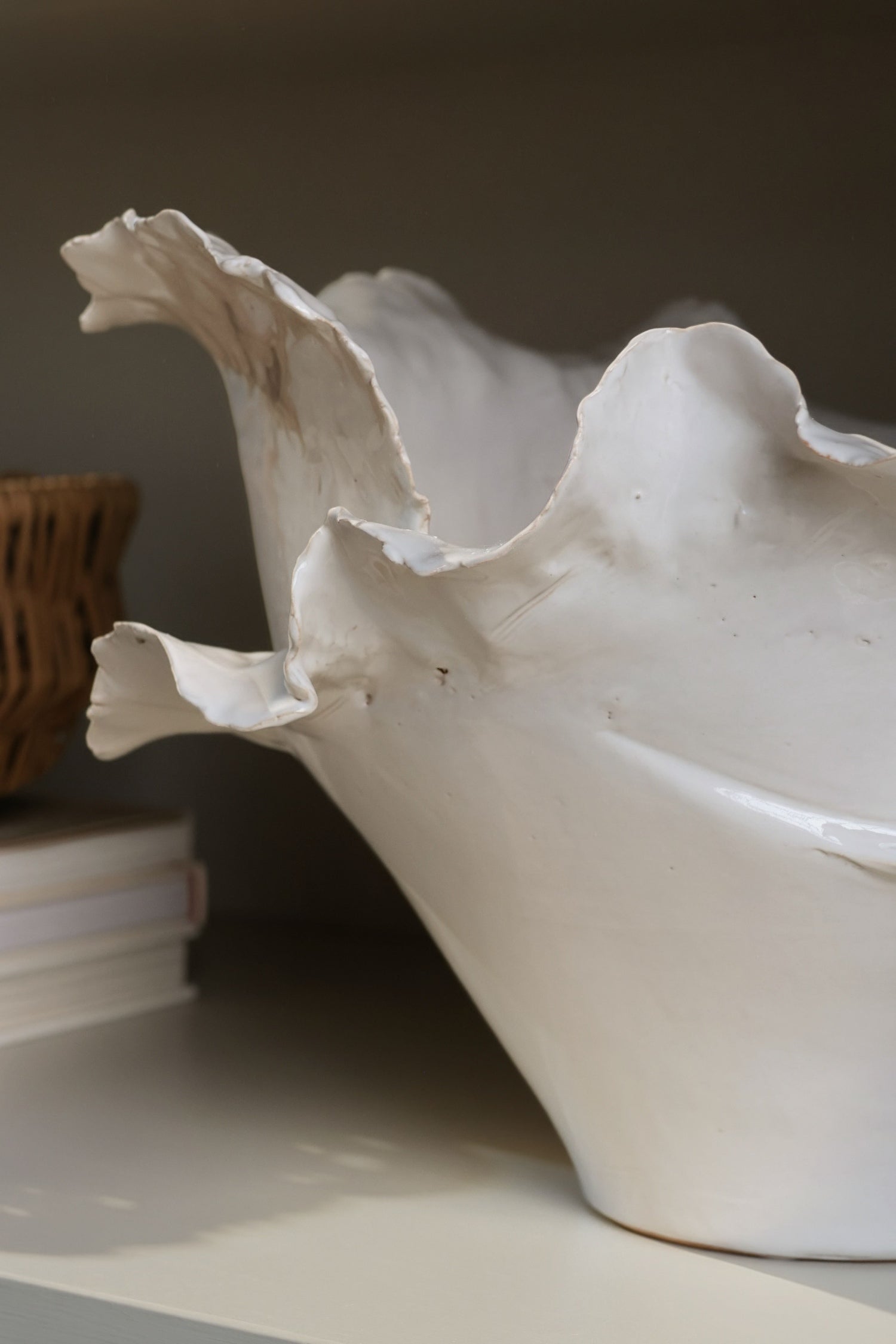 Sculptural and striking, the Burstall Bowl is a statement ceramic piece designed to elevate shelves, console and coffee tables. Each bowl is handmade and finished with a glossy waterproof glaze, giving it a refined yet organic feel. The soft rippled edges create beautiful movement and make every angle visually interesting. Perfect styled on its own or used as a vessel to plant your favourite bulbs or herbs.