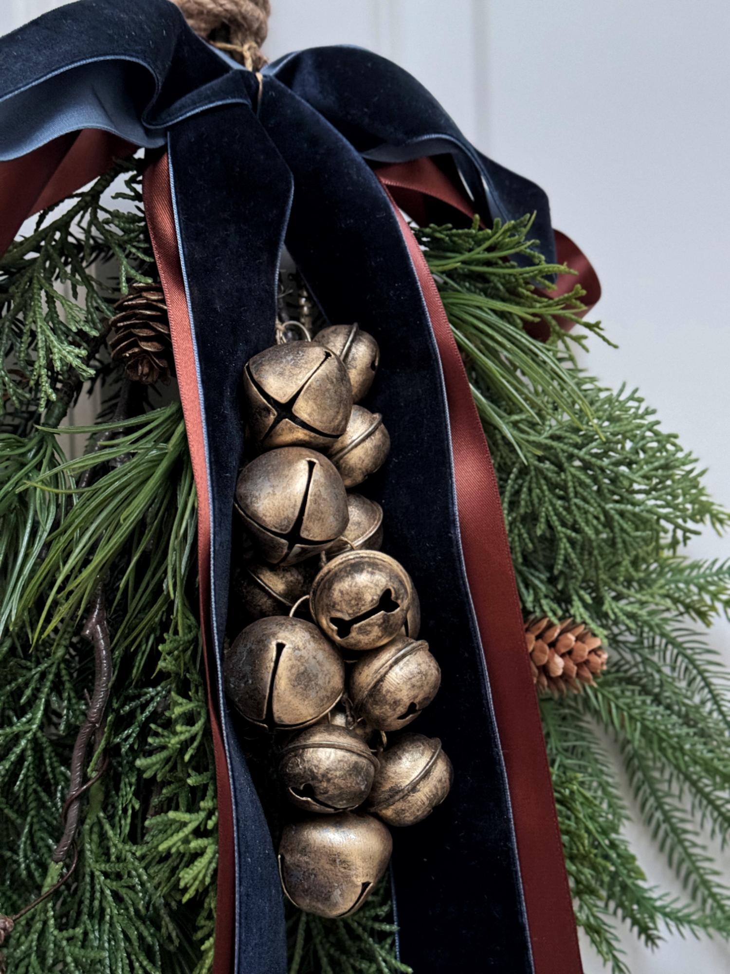Featuring a cluster of varying sized brass bells on a brown leather loop - perfect for embellishing your Christmas wreaths and garlands with a contemporary twist on classic Christmas decorations.