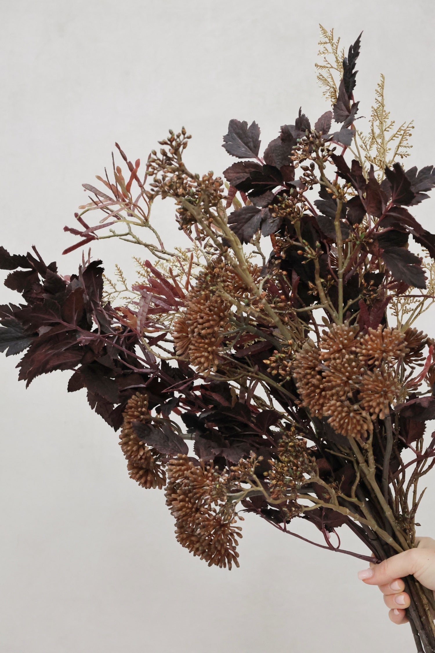 Faux deep plum cimifuga sets the tone for this beautiful autumnal bouquet with textural dried limonium, angelica and maple samaras.