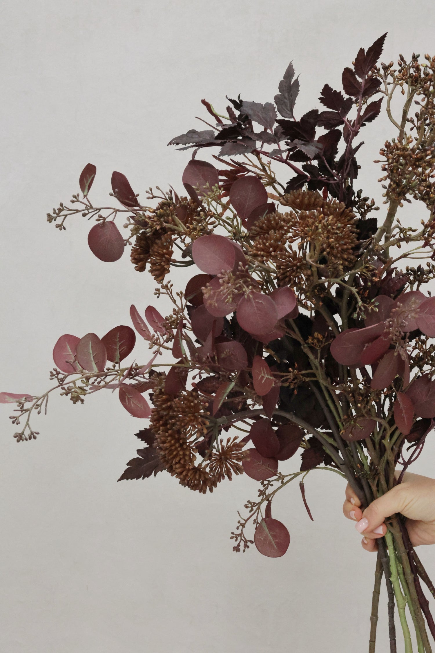 Deep plum foliage and seed head bouquet comprised of burgundy eucalyptus, plum cimifuga, seed heads and angelica.