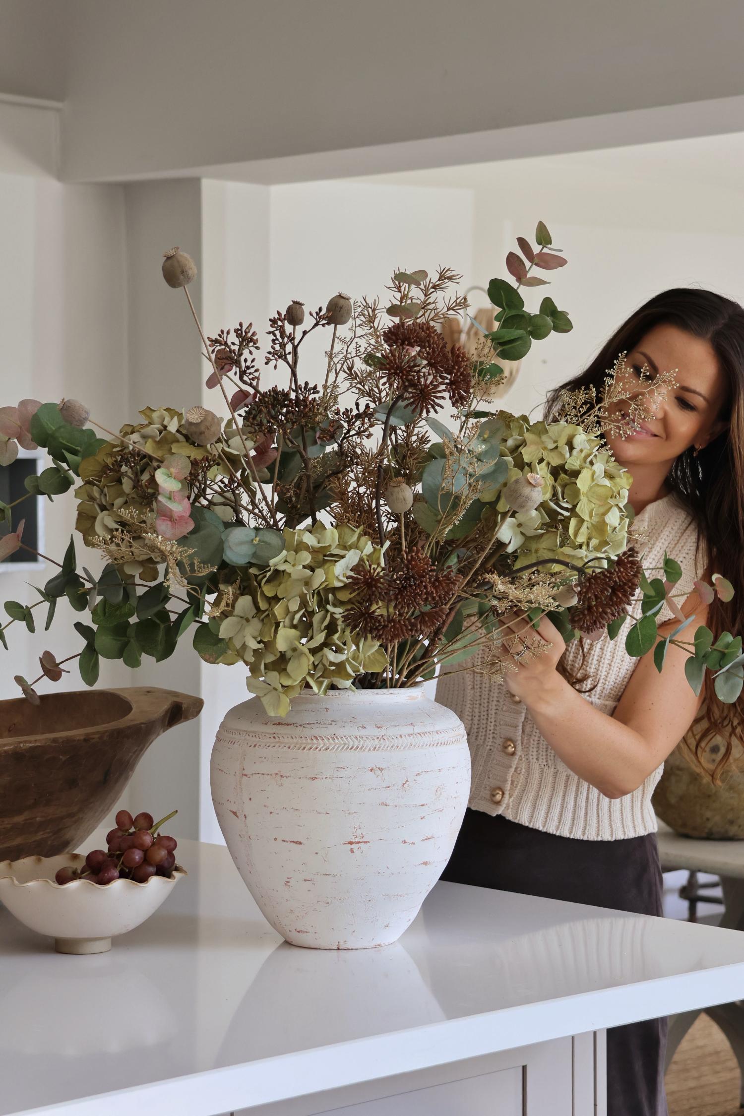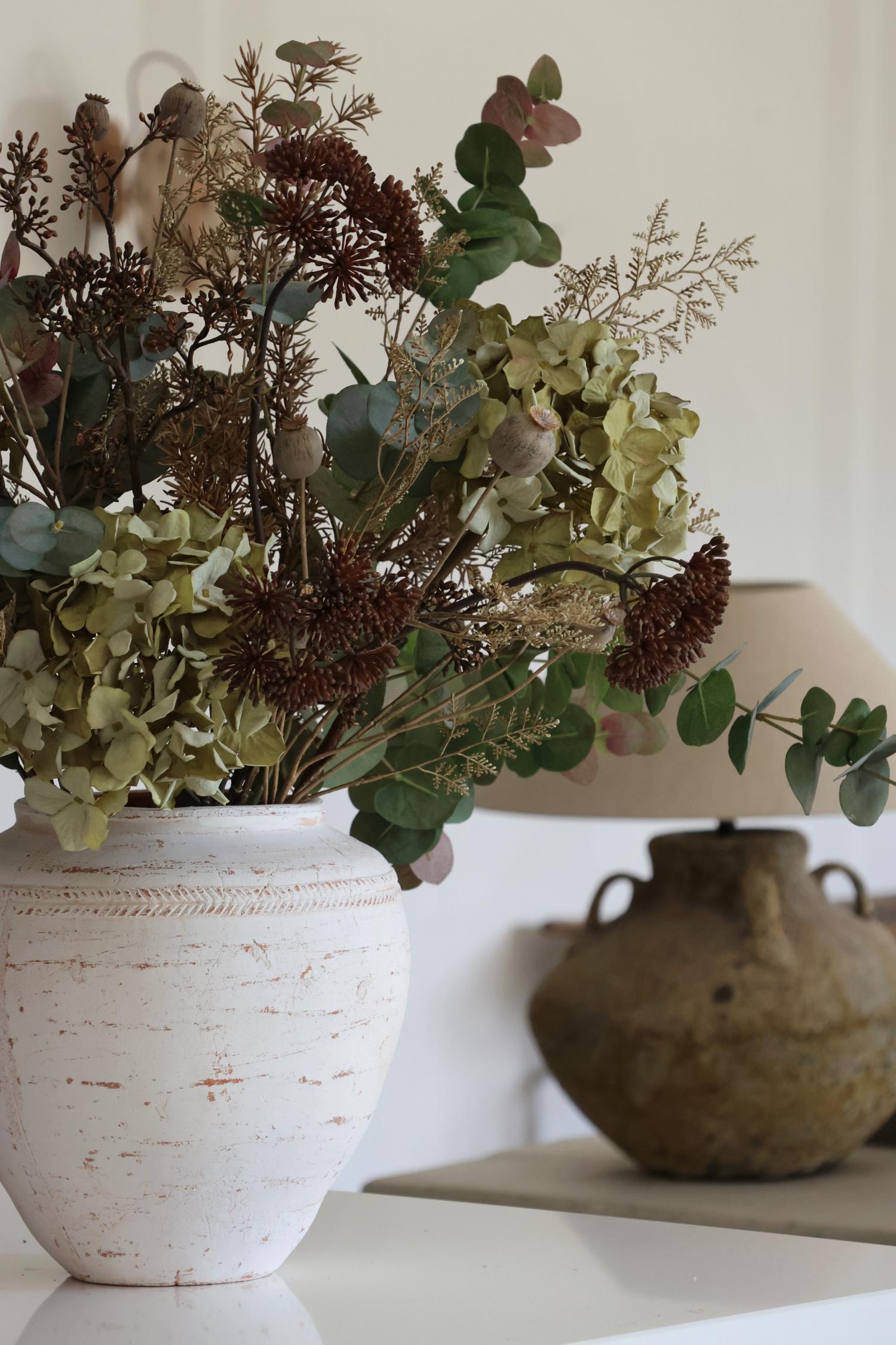 Taking inspiration from our Suffolk countryside rambles through bracken and brambles, this warming blush and soft toned green arrangement is packed with texture, depth and movement. Our faux dried Moss Green Hydrangea stems are set against blush, real touch Eucalyptus, combined with textured poppies, limonium and foxtails to perfectly capture the autumn season.