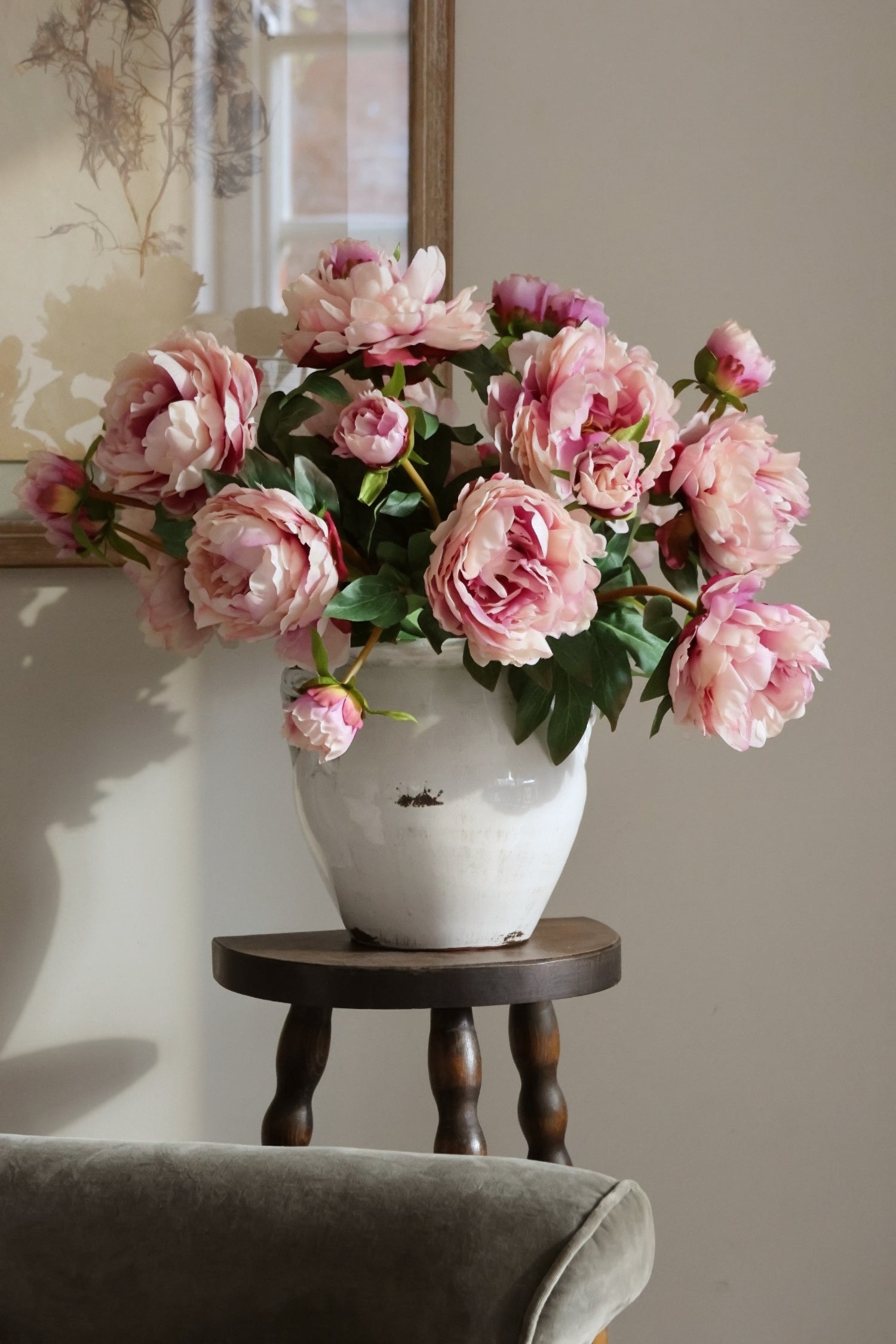 This faux blush Peony stem has a beautiful. authentic appearance, featuring an abundance of blush petals and a fully open bloom, along with a budded side shoot and luxurious green foliage. This versatile stem can be arranged en masse for a striking presentation, or paired with our blush Magnolia and blush Eucalyptus for a cohesive look.