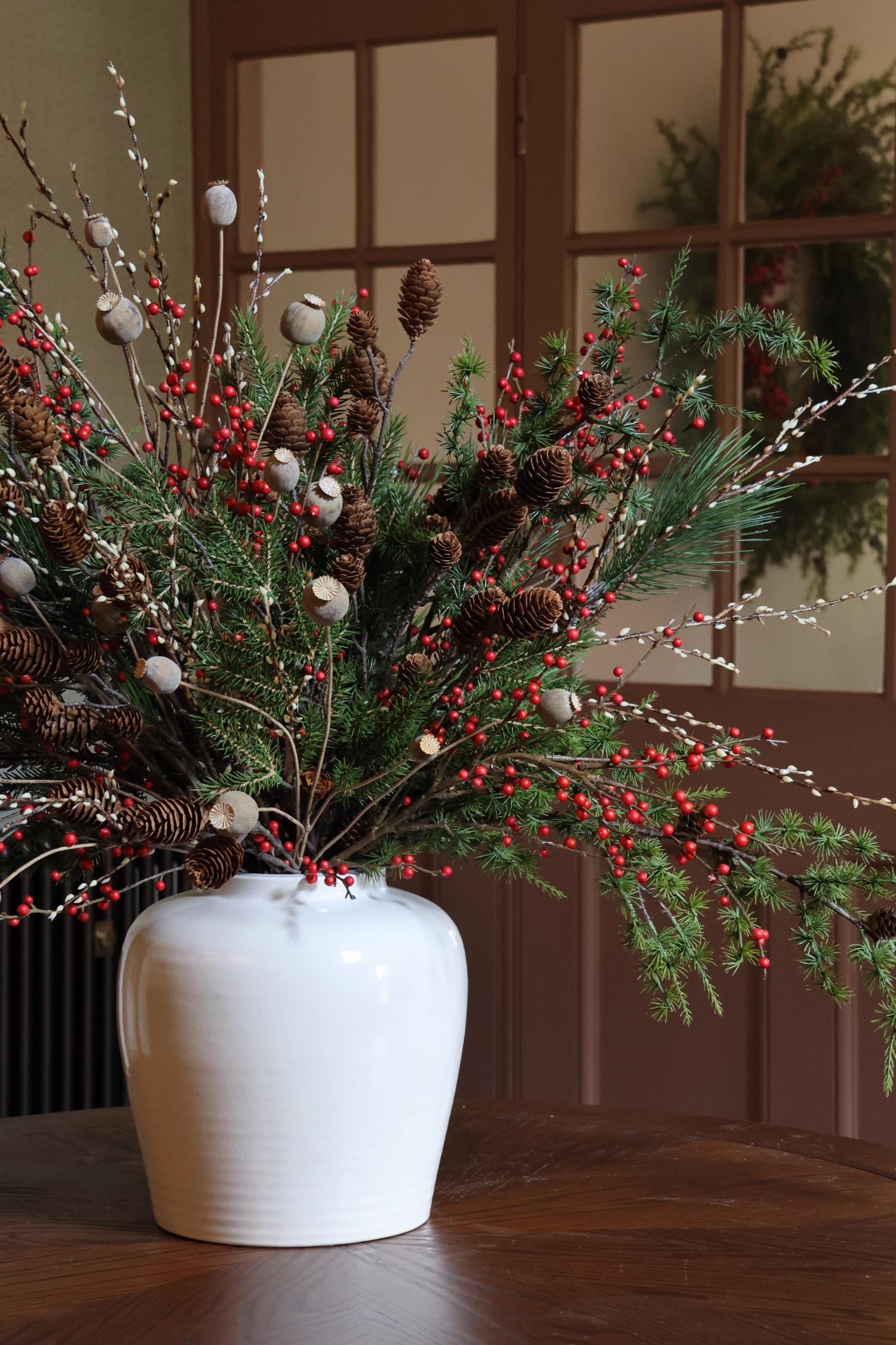 Bring the beauty of Christmas indoors with out largest and most dramatic arrangement in the collection. The Ultimate Faux Christmas Arrangement is designed to make a statement, overflowing with branches and berries as well as lush green foliage that capture the warmth and depth of the season.